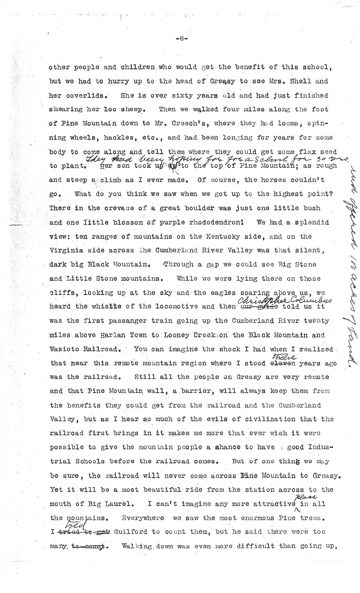 While we were lying there in those cliffs, looking up at the sky and the eagles soaring above us, we heard the whistle of the locomotive and then [(strike through) our guide] Christopher Columbus [Creech] told us it was the first passenger train going up the Cumberland River twenty miles above Harlan Town to Looney Creek on the Black Mountain and Wasioto Railroad. You can imagine the shock I had when I realized that near this remote mountain region where I stood twelve [(striike-through) eleven] years ago was the railroad. Still, all the people on Greasy are very remote and that Pine Mountain wall, a barrier, will always keep them from the benefits they could get from the railroad and the Cumberland Valley, but as I hear so much of the evils of civilization that the railroad first brings in, it makes me more than ever wish it were possible to give the mountain people a chance to have good Industrial Schools before the railroad comes. But of one thing we may be sure the railroad will never come across Pine Mountain to Greasy. Yet it will be a most beautiful ride from the station across to the mouth of Big Laurel. I can’t imagine any more attractive place in all the mountains. Everywhere we saw the most enormous pine trees. I [(strike-through) tried to] told Guilford to count them, but he said there were too many [(strike-through) to count]. Walking down was even more difficult than going up,