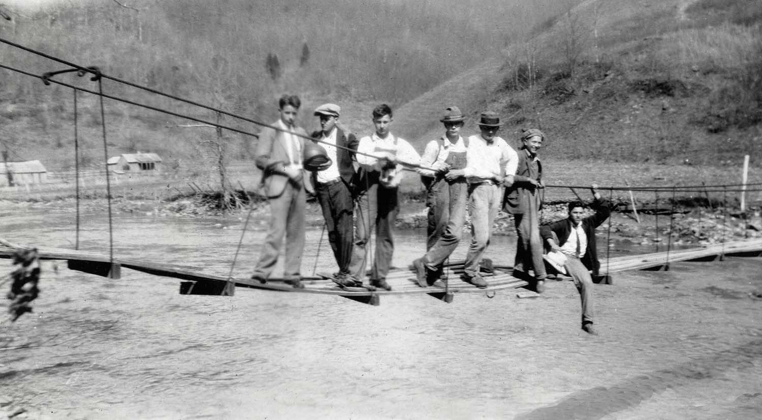 - Swinging bridge with men standing and seated. [Greasy Creek ?] Katherine Pettit Album I.