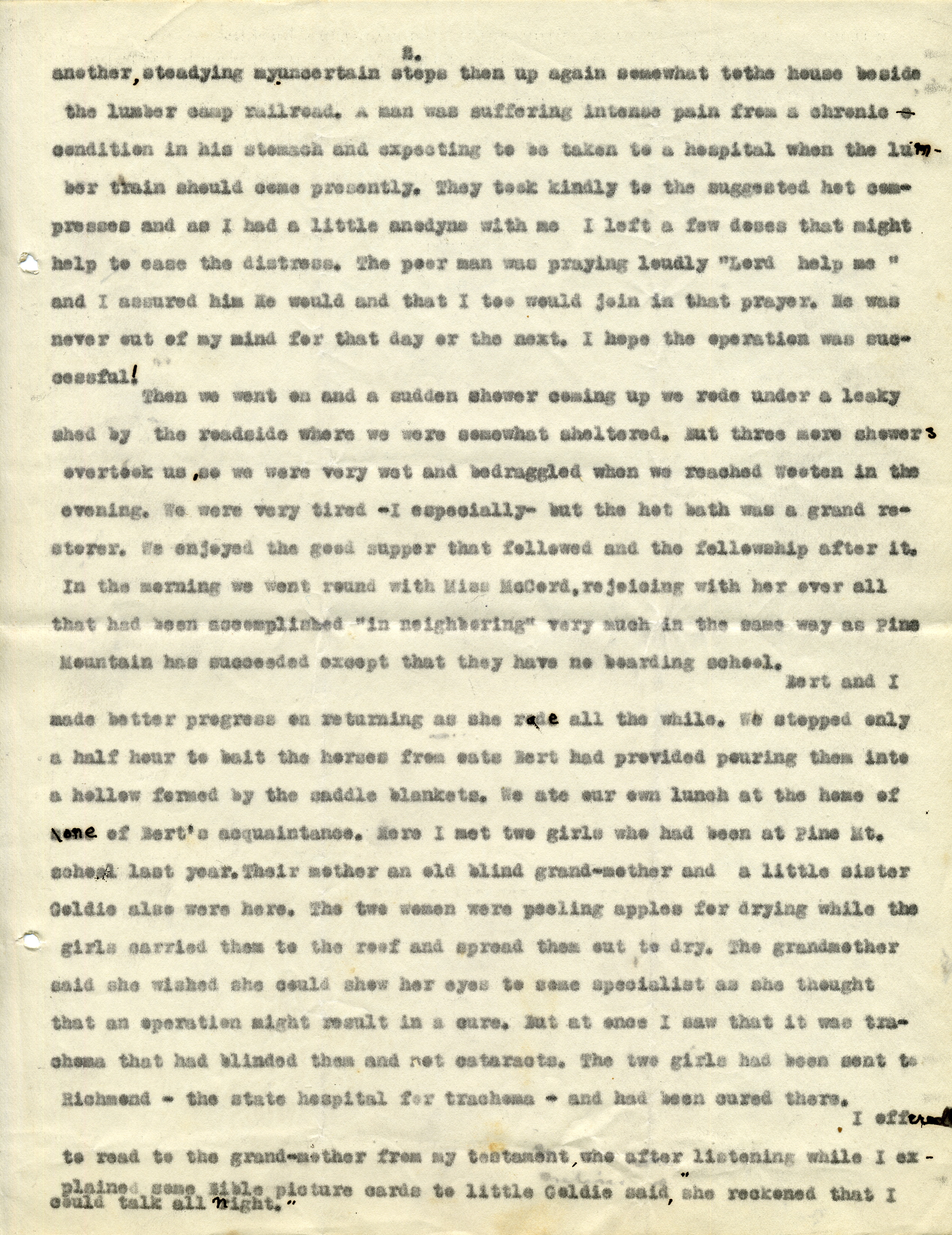 Then we went on and, a sudden shower coming up, we rode under a leaky shed by the roadside where we were somewhat sheltered. But three more showers over took us, so we were very wet and bedraggled when we reached Wooton in the evening. We were very tired – I especially – but the hot bath was a grand restorer. We enjoyed the good supper that followed and the fellowship after it. In the morning we went round with Miss McCord, rejoicing with her over all that had been accomplished “in neighboring” very much the same way as Pine Mountain has succeeded except they have no boarding school.