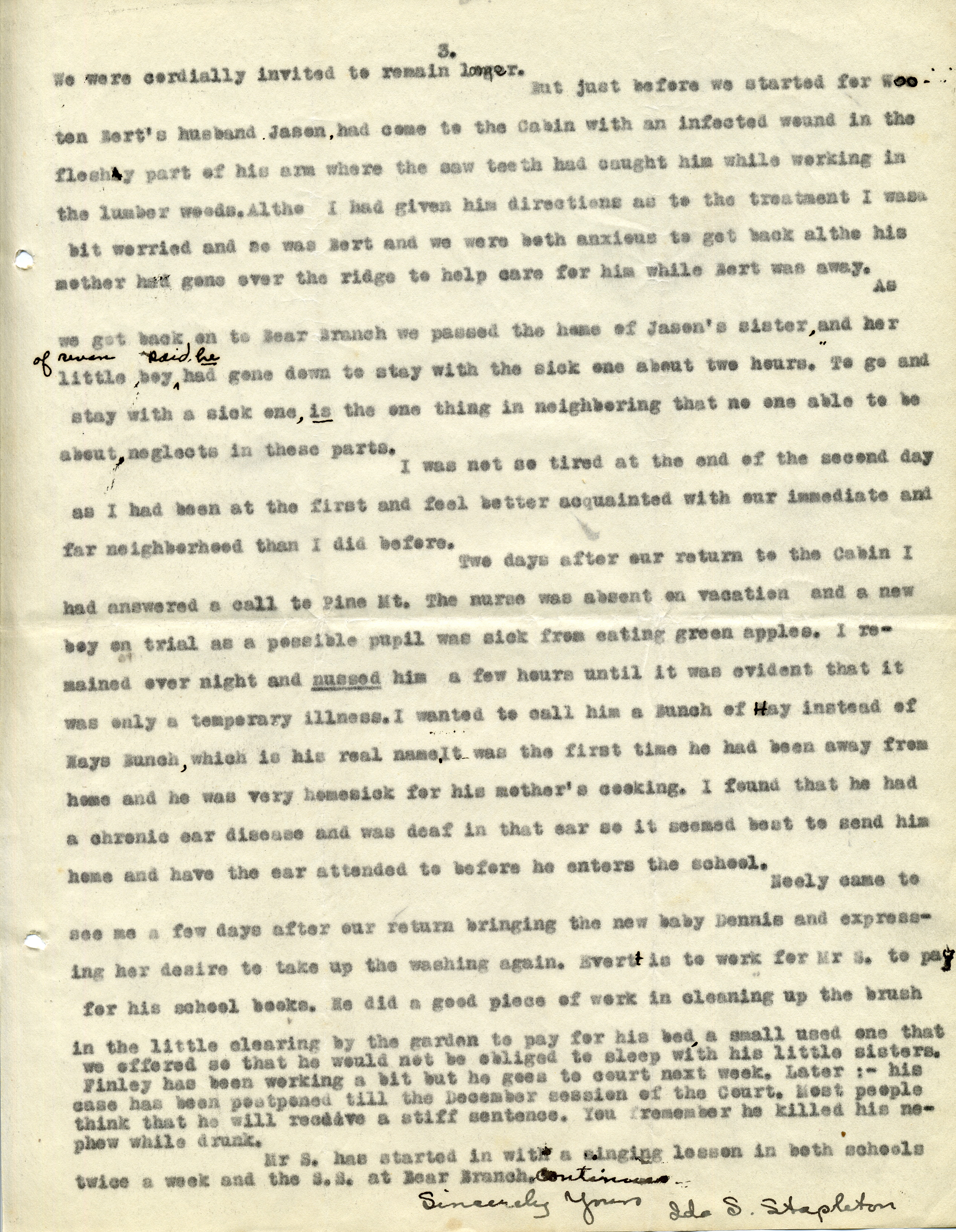 Is related to: Pine Mountain Settlement School Collections, Series 21A: Personal Narratives (Written) ; Pine Mountain Settlement School, Line Fork, Series 14: Medical ; Pine Mountain Settlement School, Line Fork, Series 10: Staff/Personnel ; Ruth Dennis; Kentucky Historical Society (KHS) http://www.kyhistory.com/ ; Kentucky Historical Society (KHS) Library, Ida Stapleton Letters to Friends SC 462 http://khscatalog.kyvl.org/vwebv/holdingsInfo?bibId=8347 ; |