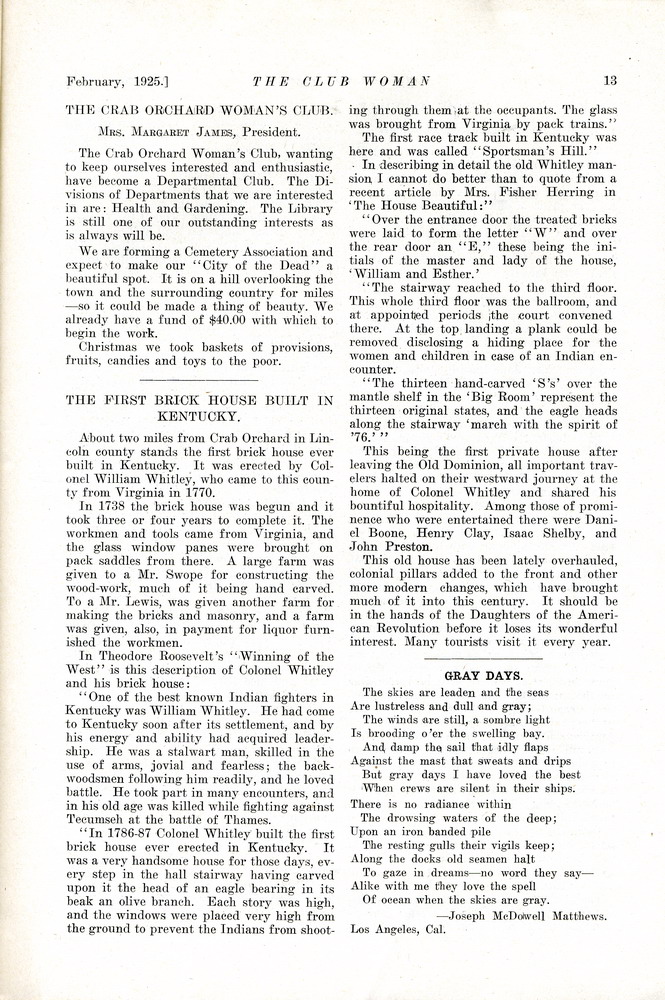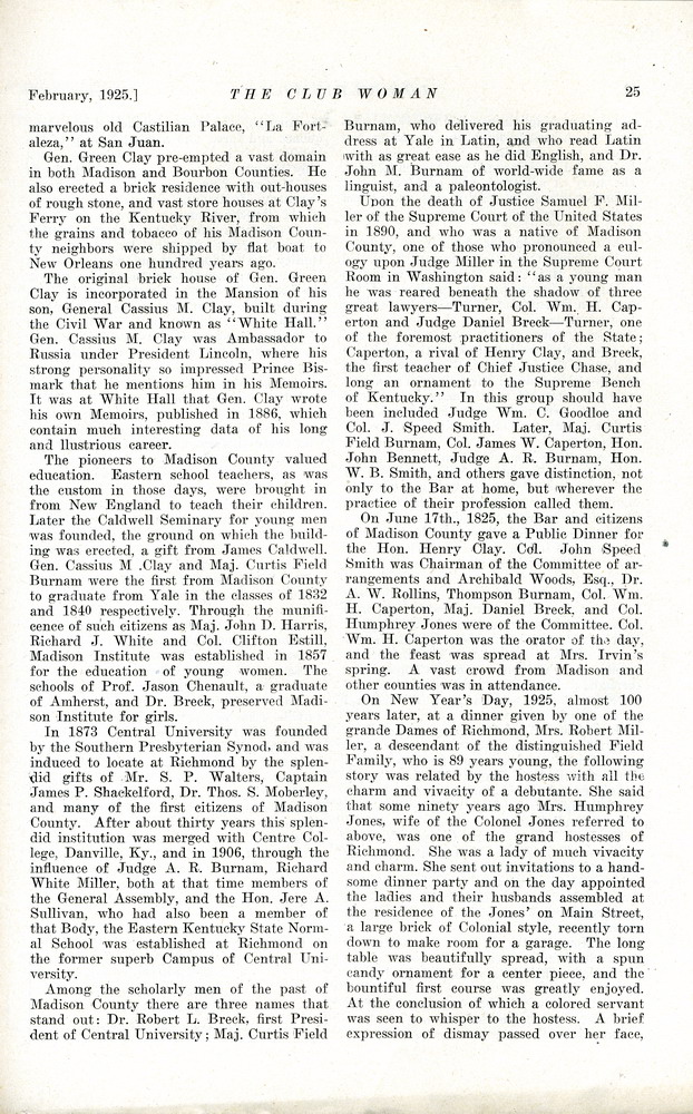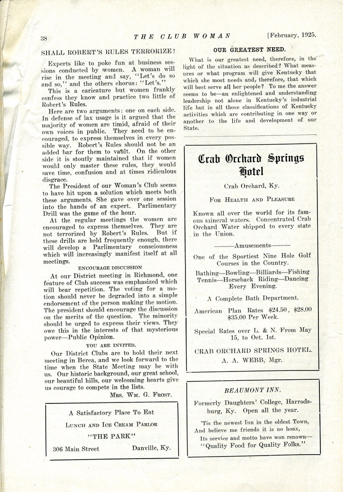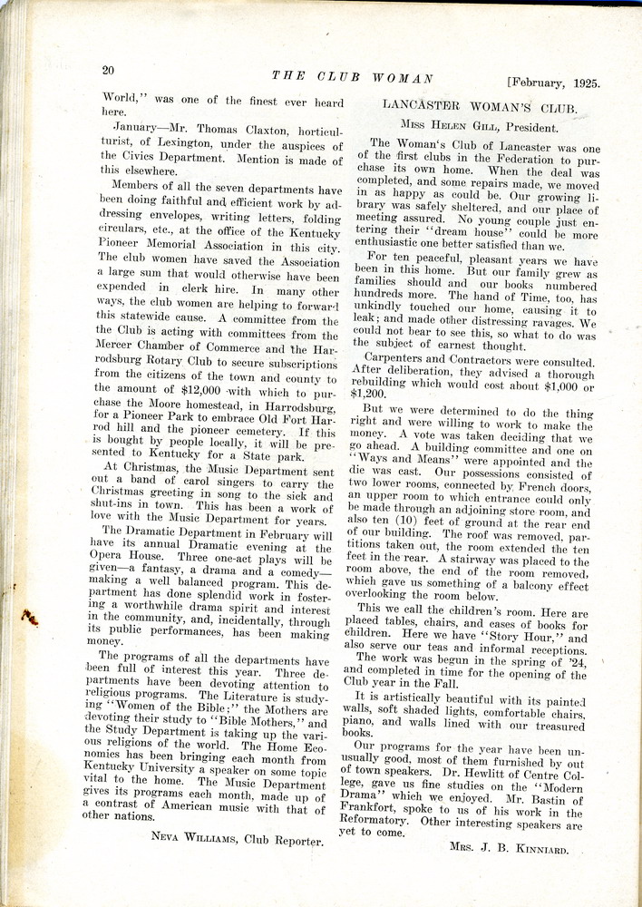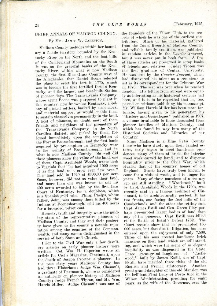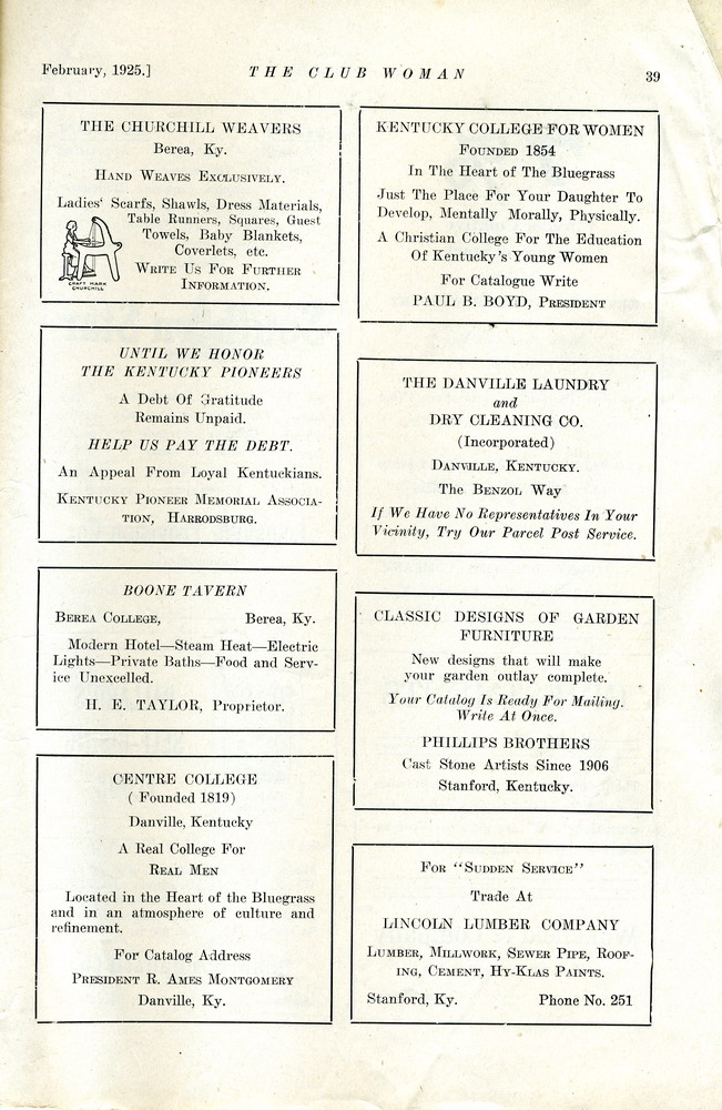 TAGS: The Club Woman – KY Federation of Women’s Clubs 1925; Echo Club; Progress Club; Berea Women’s Club; Fireside Industries; Berea College; Columbia Woman’s Club; Mark Twain; Club Women; Education; Crab Orchard Woman’s Club, Woman’s Club of Danville; Kentucky College for Women; Harrodsburg Woman’s Club; Lancaster Woman’s Club; Lawrenceburg Pierian Club; Jessamine Woman’s Club; Richmond Woman’s Club; Madison County; Shelbyville Woman’s Club; Science Hill School; Stanford Woman’s Club; St. Asaph’s or Logan’s Fort; The Twentieth Amendment; Child Labor Amendment; Robert’s Rules