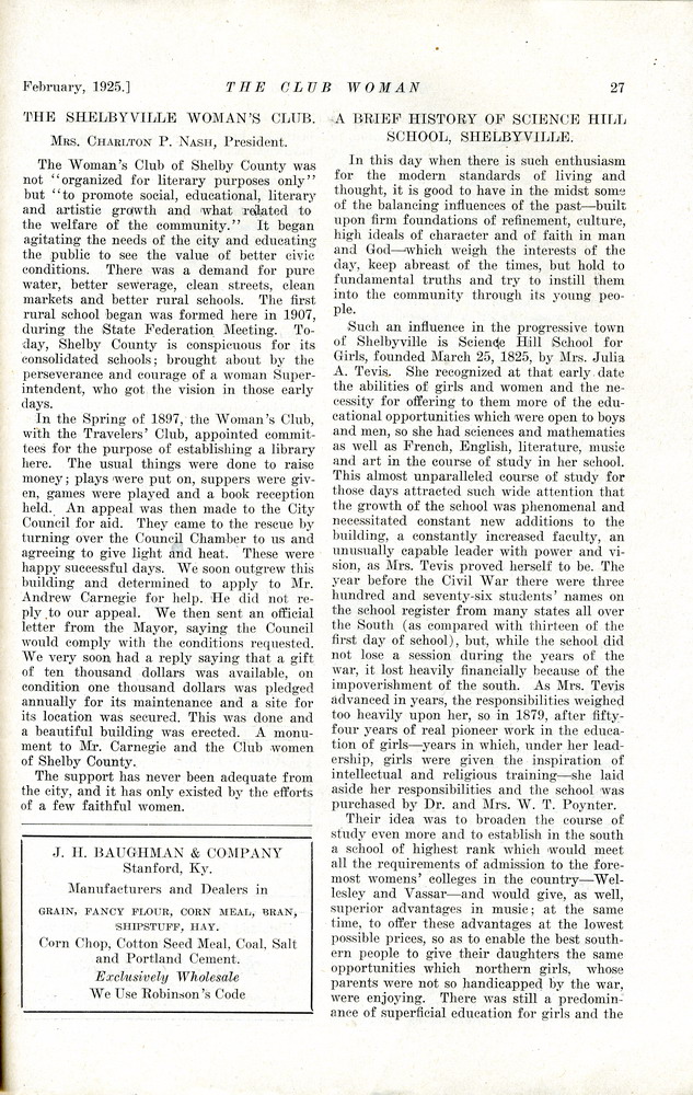 The Shelbyville Woman’s Club, Mrs. Charlton P. Nash, President