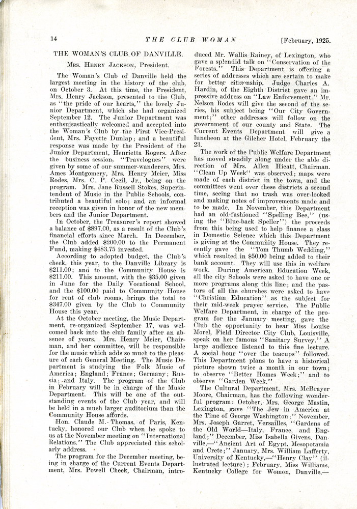 The Woman’s Club of Danville, Mrs. Henry Jackson, President