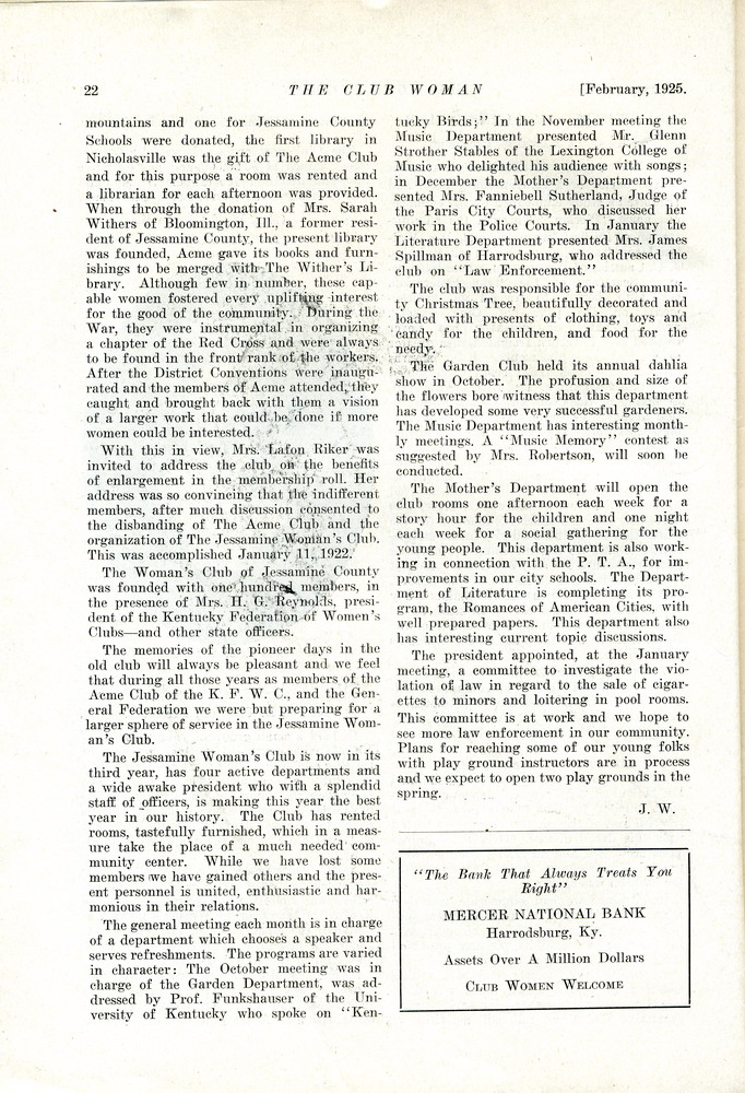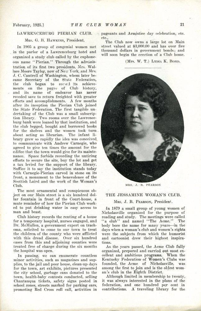 The Jessamine Woman’s Club, Mrs. J.B. Pearson, President