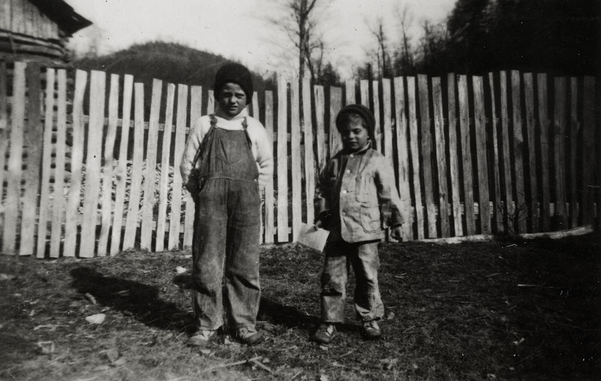 - Two children and paling fence behind. cobb_alice_077