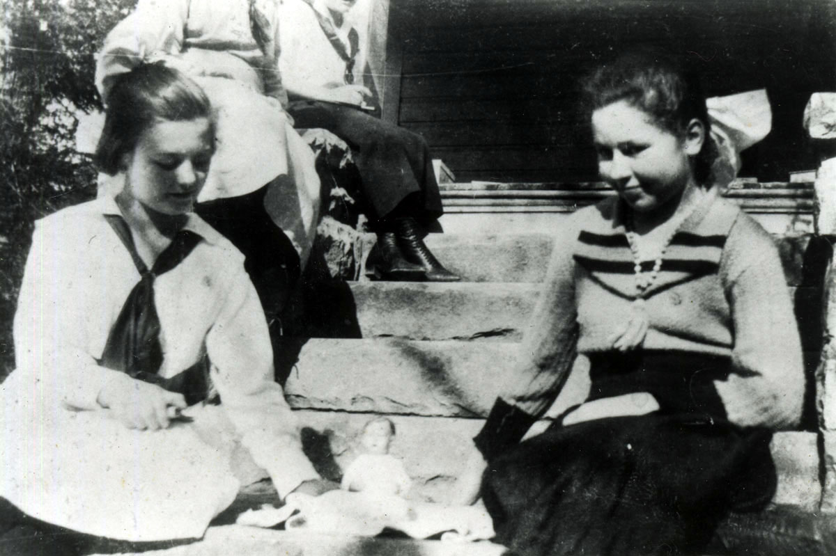 - Two girls with a doll on steps. cobb_alice_025