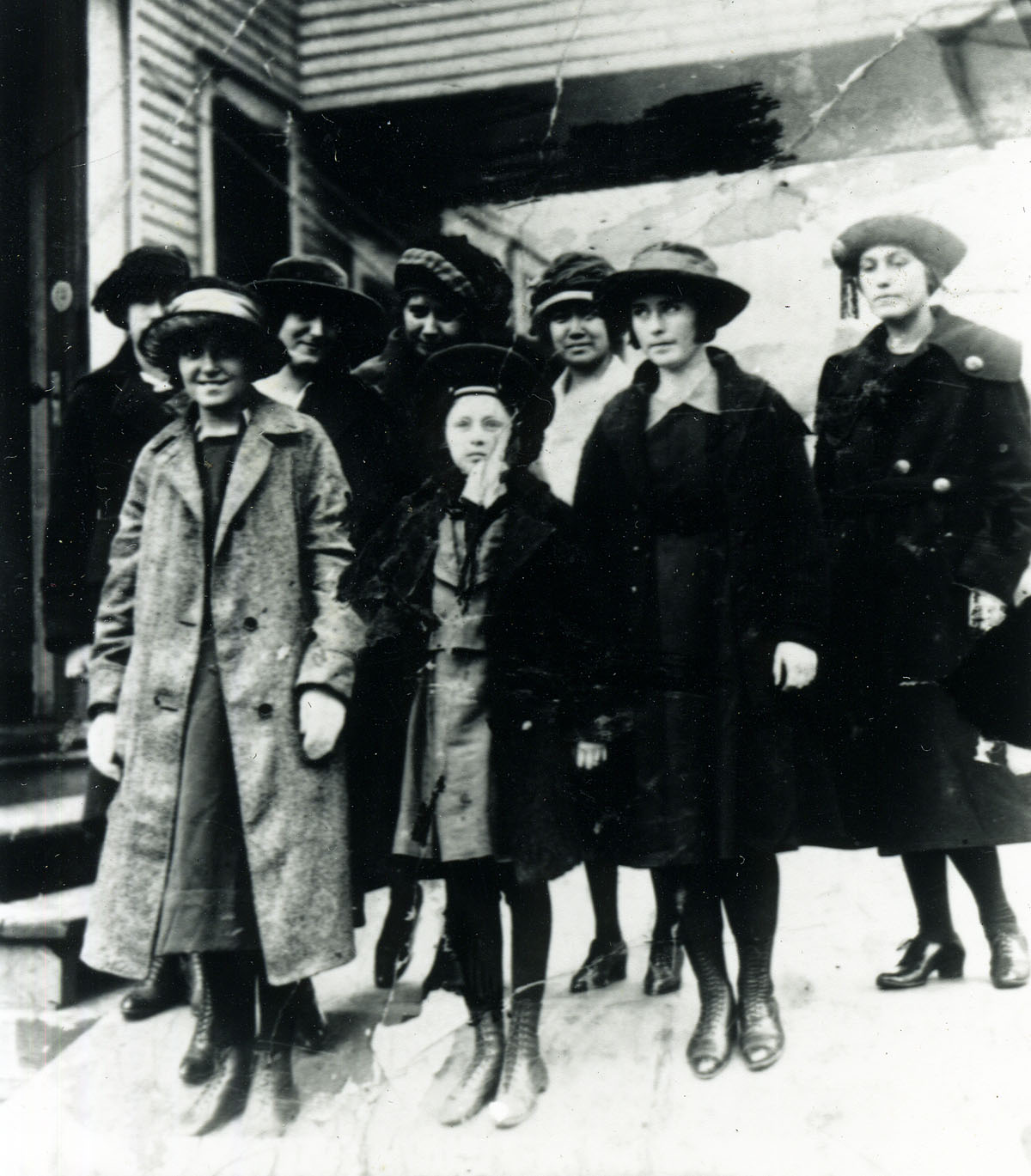 - Top row (back, left to rt): Nora Howard (Bead nickname); Sudie Delphdin; Miss Daisy Bilbrey. (Front Row left to rt): Maya Sudo, third from rt.) Tuki (?); May Combs; Elosi Smith (far rt); Hulda Howard; Selma Gallegly (George Gallegly’s sister). [cobb_alice_046.jpg]