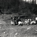 - Group seated on ground and log on barren hillside. [Staff?] cobb_alice_052