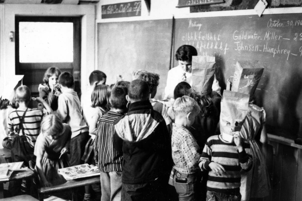 - 1809 Halloween in Mrs. Whitaker’s Room: Norma Callahan and 4 masked students. [58_Life and Work_Children and Classes_018.jpg]
