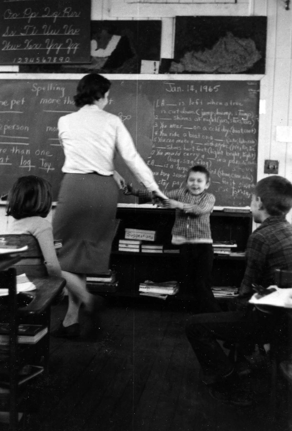 - 1805 Frankie Scearse, Sharon Boggs, Cathie Creech (at board), Bonnie Turner, Teacher standing at blackboard. [58_Life-and- Work_Children-and-Classes_011.jpg]