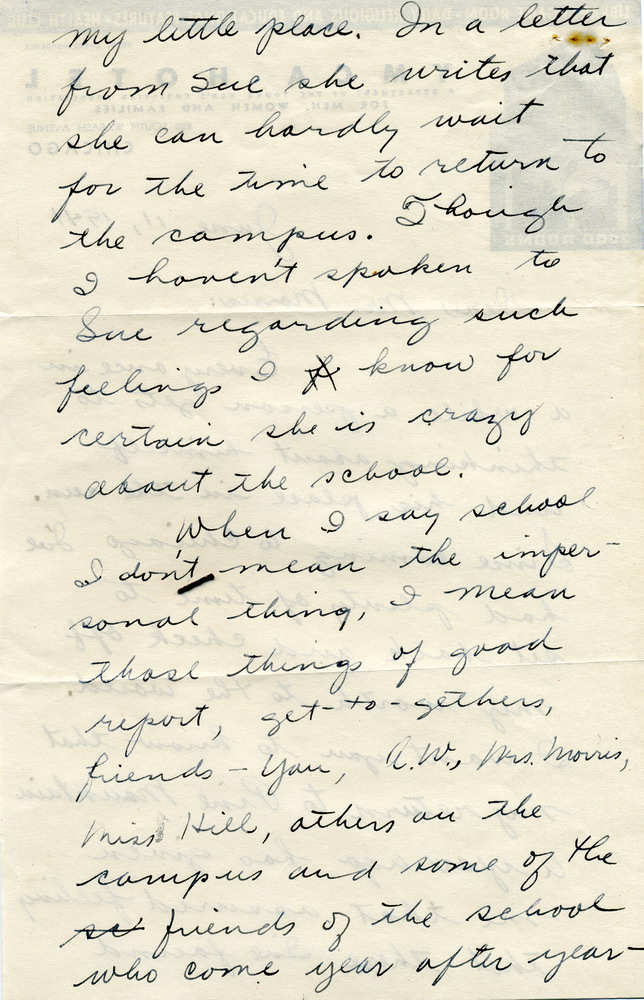 Though I haven’t spoken to Sue regarding such feelings I know for certain she is crazy about the school. When I say school I don’t mean the impersonal thing, I mean those things of good report, get-togethers, friends –you, A.W. [Dr. Alfreda Withington?], Mrs. Morris, Miss [Gladys] Hill, others on the campus and some of the friends of the school who come year after year — Miss [Abby] Christensen, Mrs. [Mary Rockwell] Hook.
