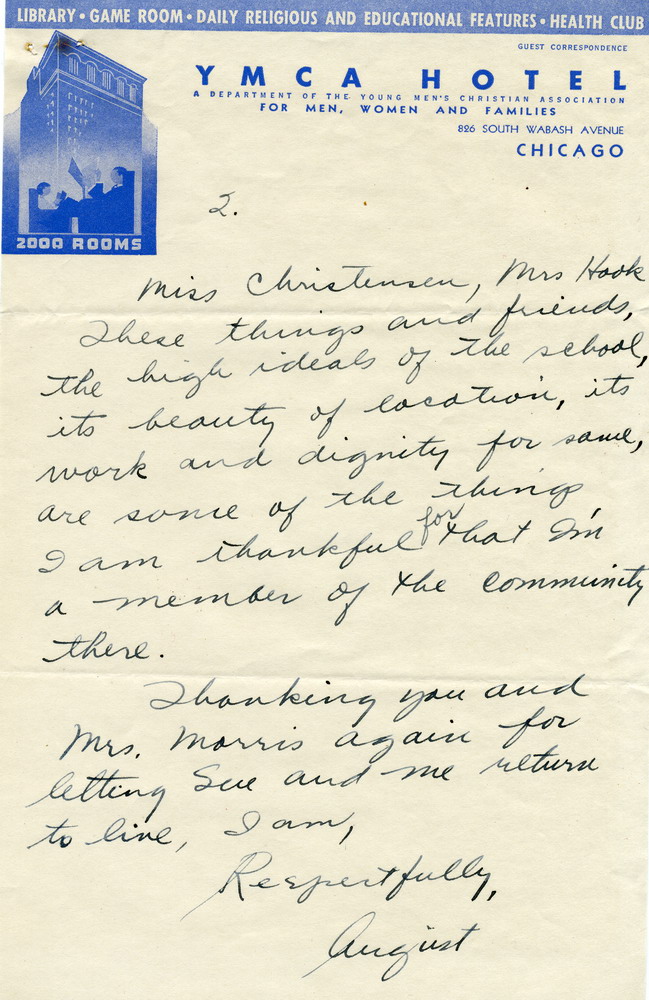 In 1941, Glyn Morris arranged for August to attend the Keating School of Linotyping in Chicago, Illinois, for six weeks of training. The school was sponsored by the Mergenthaler Linotype Company. While there, August wrote the following letter to Glyn Morris dated June 11, 1941, expressing how Pine Mountain had influenced his life: