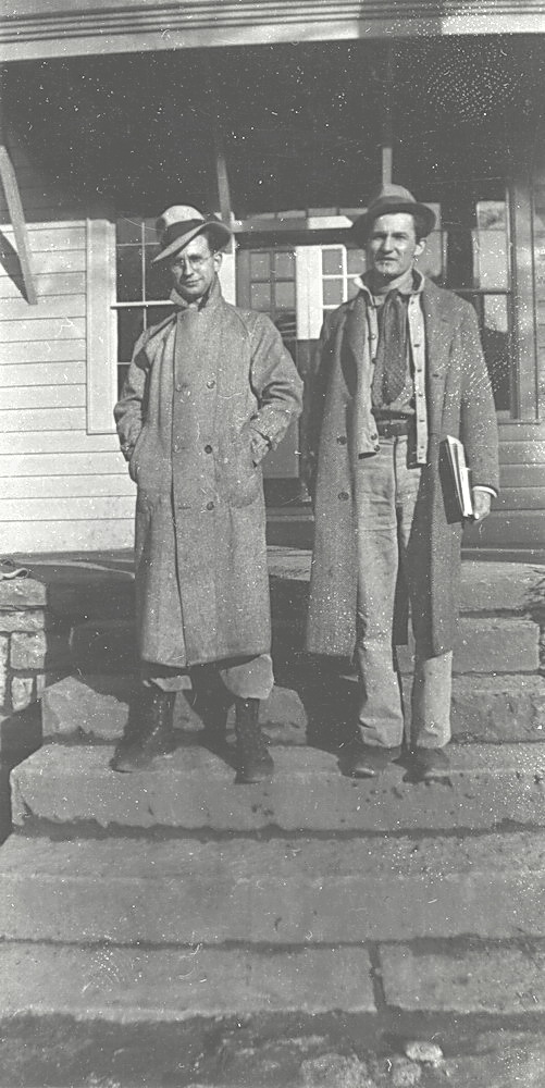 - August Angel (right) standing with fellow teacher, Arthur Dodd, on the steps of Old Laurel House, c. 1930s. [angel_0012.jpg ] (Click on image for full view.)