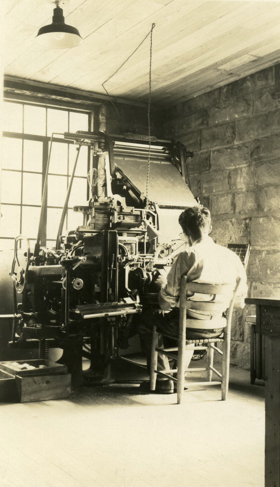 For the next four years, 1934 to 1938, August served as a paid instructor in science and printing at the School. He assisted Glyn Morris in setting up the first print shop in the Office building for students to receive hands-on experience in a useful trade. The shop provided all the printed material that was needed at the School, such as The Pine Cone, Chapel programs, special event programs, staff and student stationery, office stationery, pads, business office materials, and Notes. Several books were also printed, including the first edition of At Home in the Hills, a collection of John Spelman‘s linoleum cuts, and the hand-bound A Pine Mountain Study in Civics by Everett K. Wilson. Eventually, the student shop was moved to Draper, the Boys’ Industrial Building.