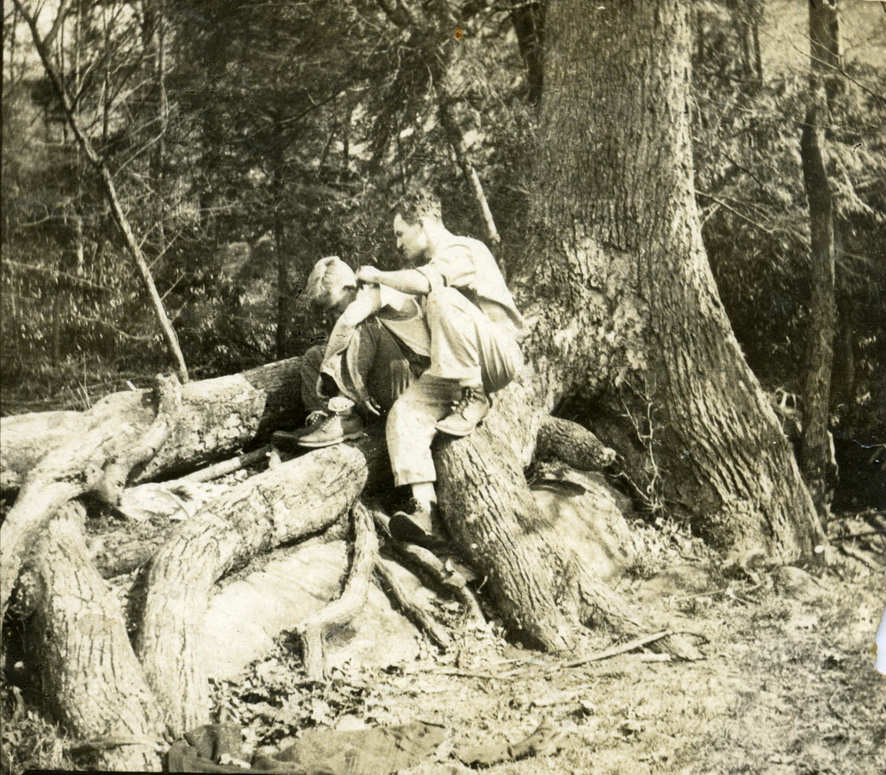 - August Angel cutting student’s hair, c. 1930s. The poplar tree with its intertwined roots, still stands at the edge of the PMSS playground as of 2013. [angel_0032.jpg]