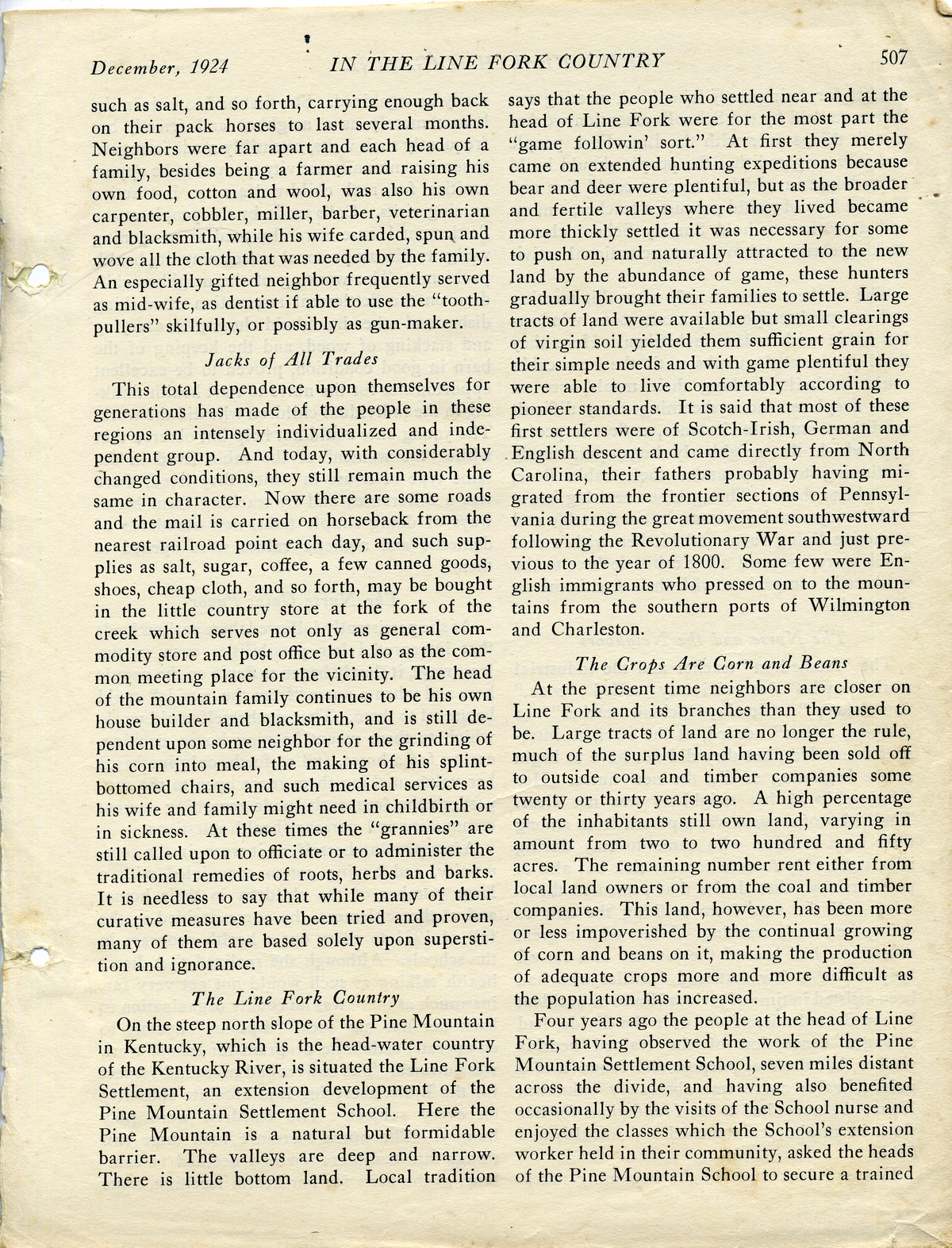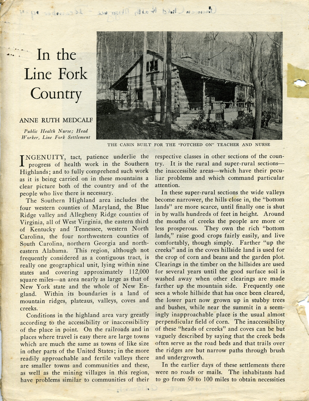 - Magazine article: Anne Ruth Medcalf – “In the Line Fork Country,” American Child Health Magazine, December 1924. p. 2. [lin_frk_1924_002.jpg]