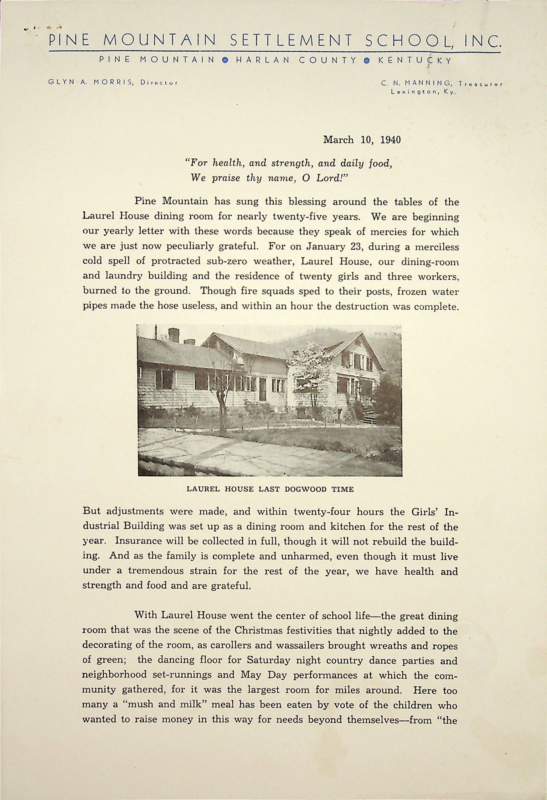 Pine Mountain has sung this blessing around the tables of the Laurel House dining room for nearly twenty-five years. We are beginning our yearly letter with these words because they speak of mercies for which we are just now peculiarly grateful. For on January 23, during a merciless cold spell of protracted sub-zero weather, Laurel House, our dining-room and laundry building and the residence of twenty girls and three workers, burned to the ground. Though fire squads sped to their posts, frozen water pipes made the hose useless, and within an hour the destruction was complete.