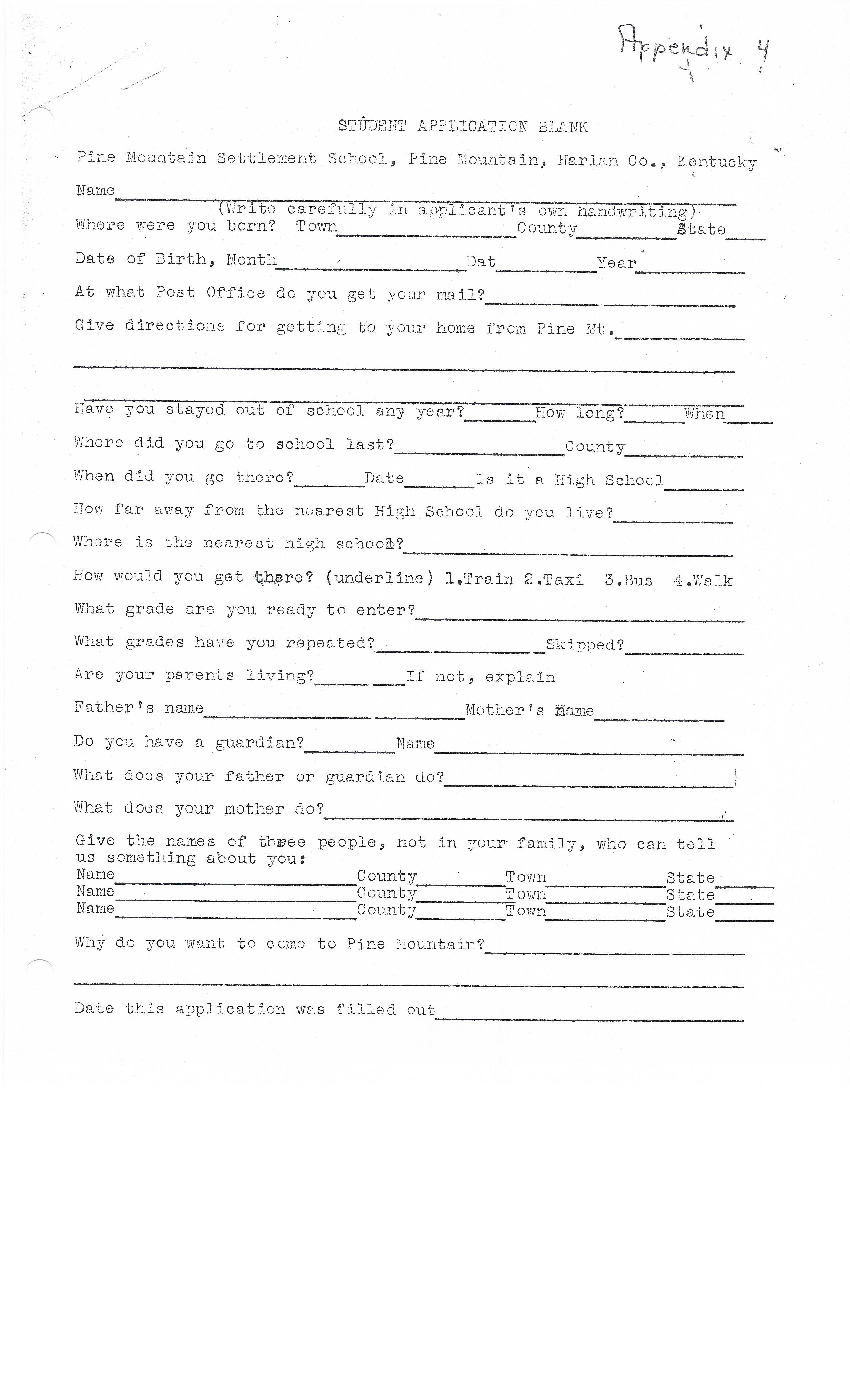 TAGS: Glyn Morris Study & Recommendations X Appendix; Glyn Morris; Directors; Pine Mountain Settlement School; Harlan County, KY; education; educational study; planning; institutional reports; institutional management; educational recommendations; 1942; institutional history; maps; charts; graphs; high school youth; student regional distribution; 1931-1941 data; appendices; “Educational temperature”; application forms; financial comparisons.