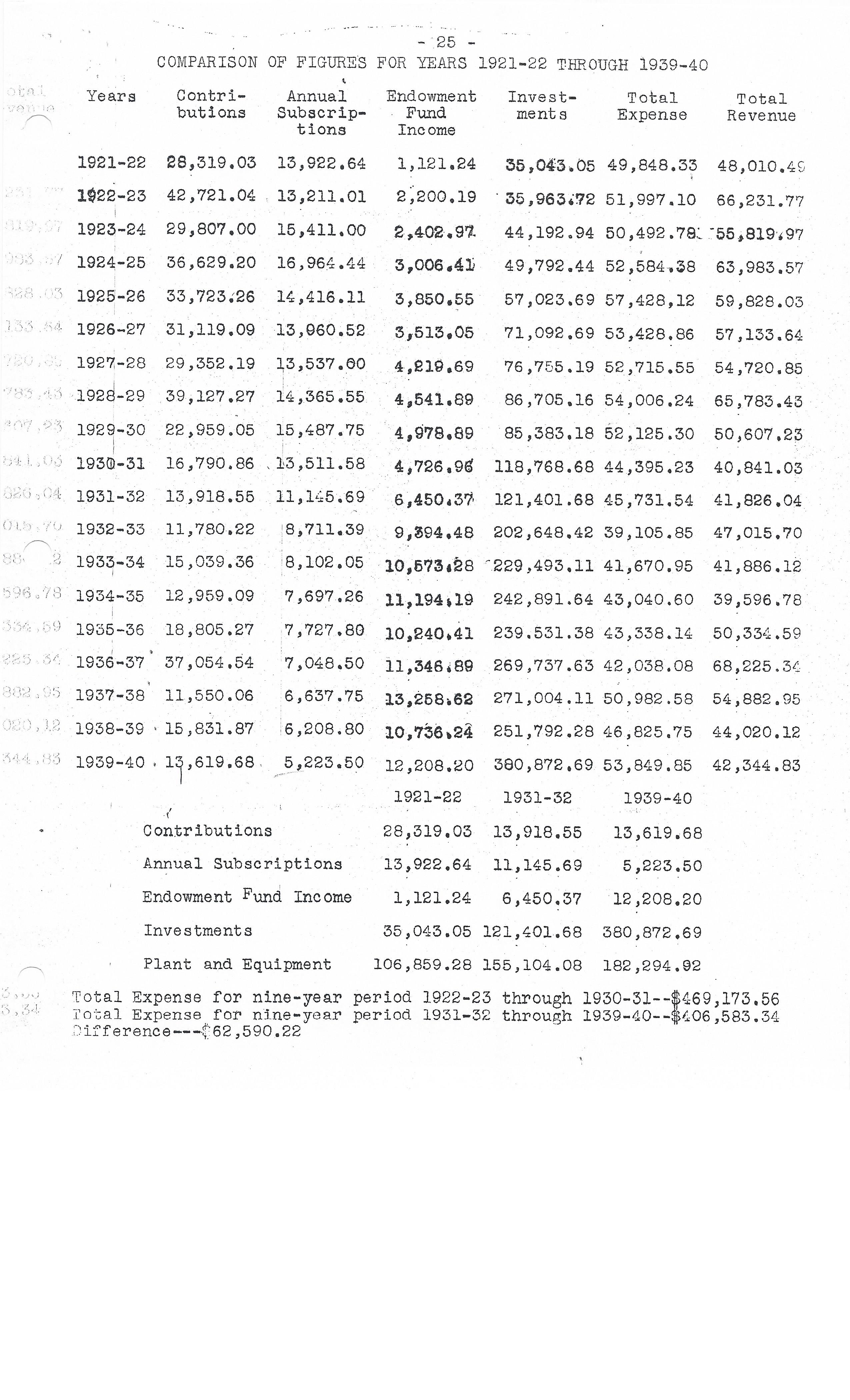 [7 columns of figures, with these headers: Years, Contributions, Annual Subscriptions, Endowment Fund Income, Investments, Total Expense, Total Revenue.]