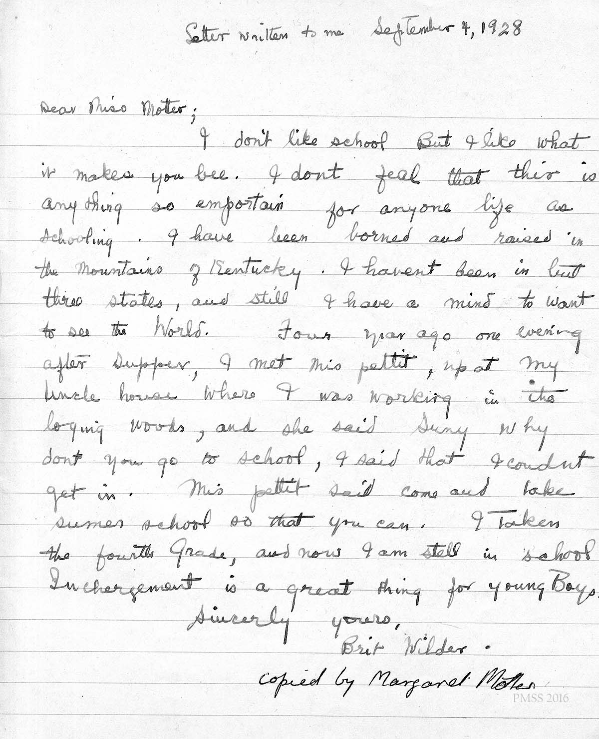 1. Brit Wilder to Miss [Margaret] Motter. Sept. 4, 1928. “I don’t like school But I like what it makes you bee. I don’t feal that thir is anything so emportain for anyone life as schooling…” ” Mentions Miss [Katherine] Pettit. [Go to EDUCATION Children’s Writing (01) Brit Wilder for full transcription.]