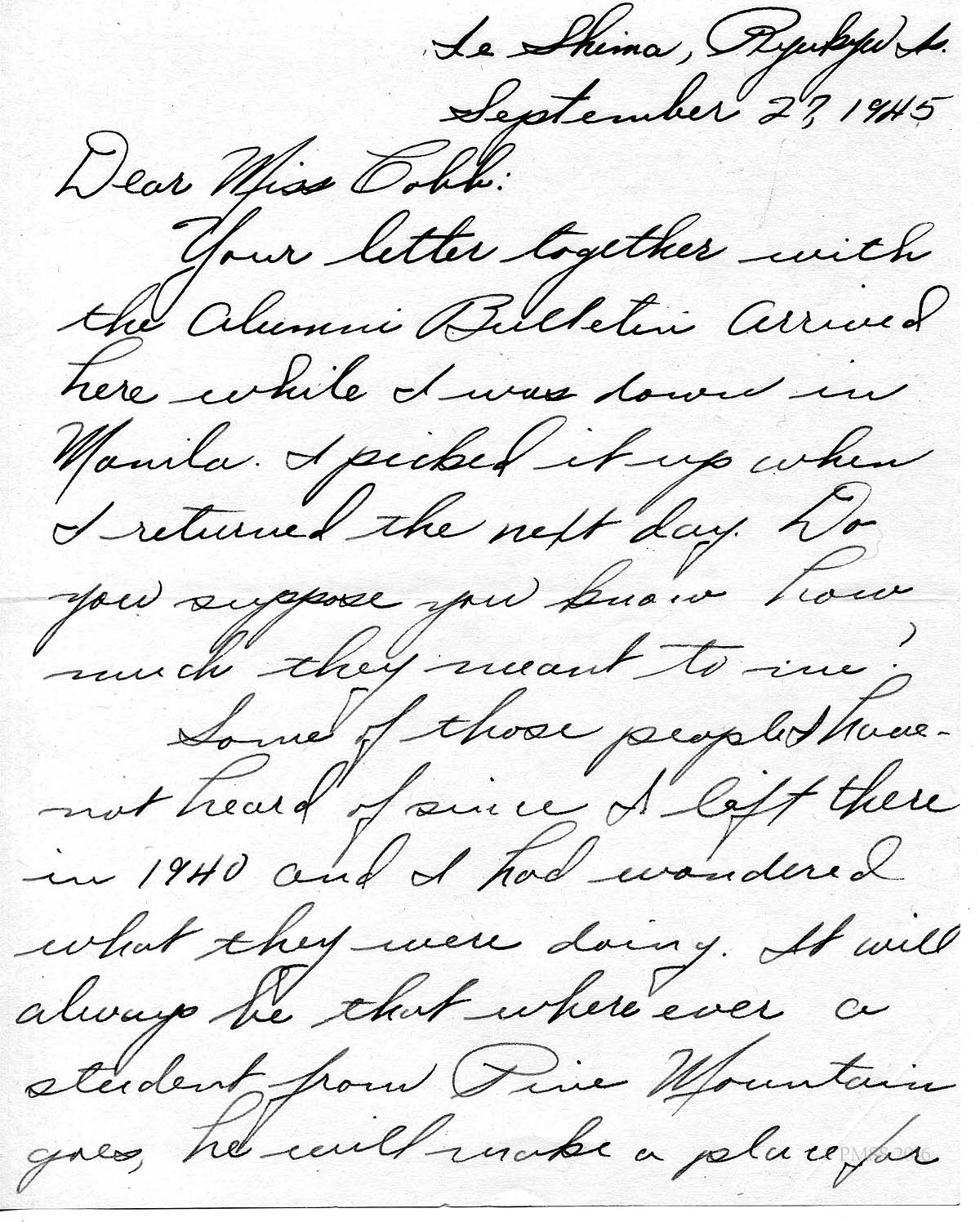 2. Wilbur Wilder to Alice Cobb. September 27, 1945. Shima, Ryukyu Is. [Okinawa Prefecture, Japan] “Your letter…arrived here while I was down in Manila. I picked it up when I returned the next day. Do you suppose you know how much they meant to me? … I am awfully sorry to hear that some of our boys were killed in action. I knew “Bud” Pennington and Henry Creech very well. We certainly paid a heavy price to teach the rest of the world what we of Pine Mountain already knew. The diplomats of many nations could learn many lessons there.” Also mentions Stella Taylor and Lucille Christian.