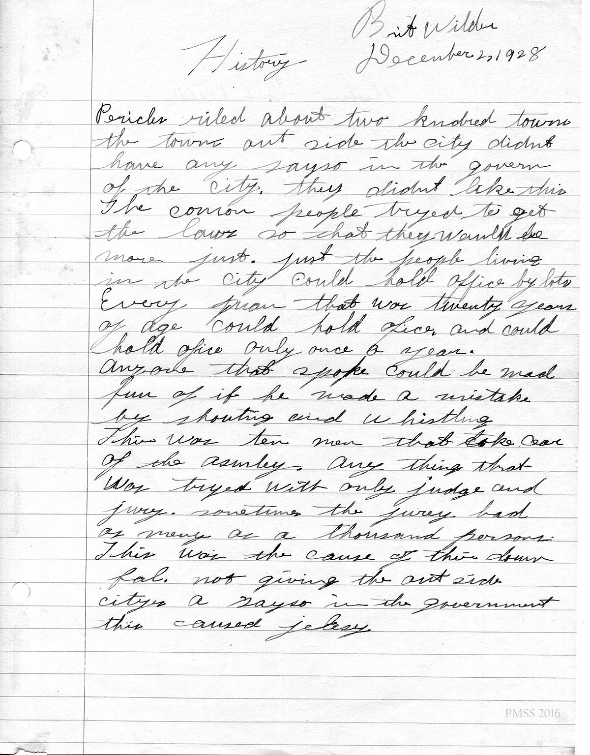 5. Brit Wilder. December 2, 1928. “History. Pericles riled about two kndred towns the towns out side the city didnt have any sayso in the govern of the city. they didn’t like this. The comon people tryed to get the laws so that they would be more just. Just the people livin in the city could hold office by lots…” [Go to EDUCATION Children’s Writing (01) Brit Wilder for full transcription.]