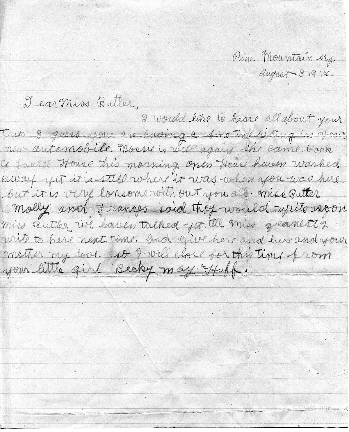 6. Becky May [Mae] Huff. August 3, 1918. “Dear Miss [Marguerite] Butler, I would like to heare all about your trip. I guess you are having a fine time riding in your new automobile. Mossie is well again she came back to Laurel House this morning open House haven washed away yet it is still where it was when was here but it is very lonsome without you all…” Mentions Molly, Frances and Miss Jeanette. [For full transcription, go to EDUCATION Children’s Writing (06, 44) Becky May Huff.]