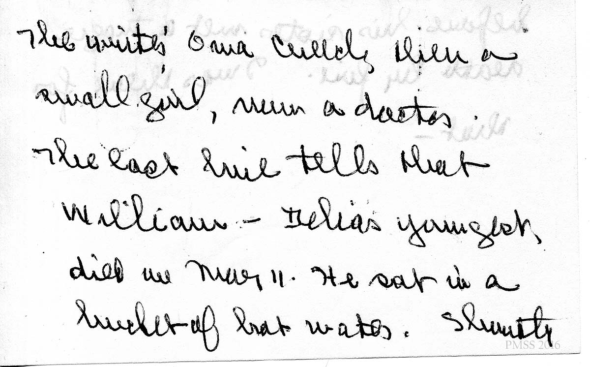 7. A note written by Marguerite Butler Bidstrup, n.d., describing a letter she received from Oma Creech. “The last line tells that William — Delia’s youngest — died on May 11. He sat in a bucket of hot water, shortly before his sister met a tragic death by fire. I was there for that….” [See #12 for listing of Oma Creech’s letter. For full translation of the note and letter, see biography of OMA CREECH here.]