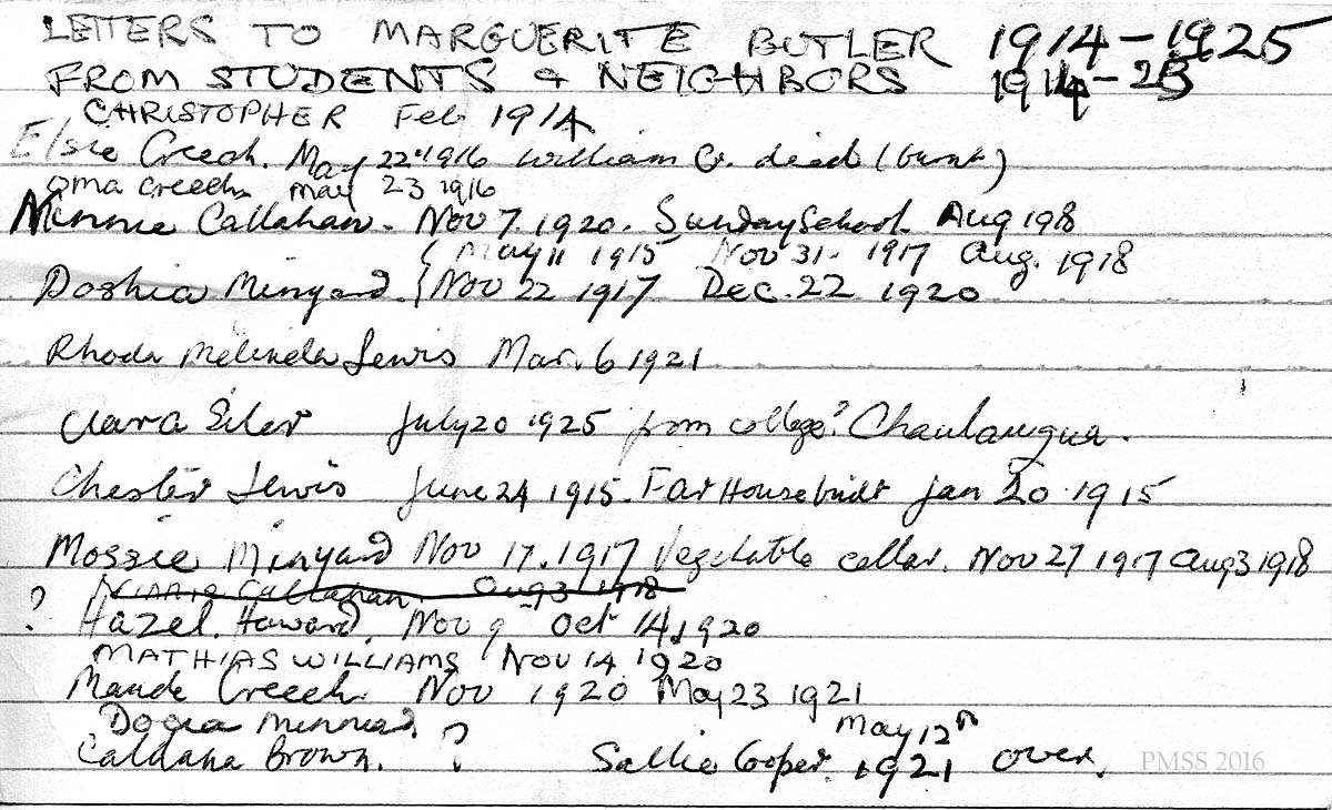 8. List of “Letters to Marguerite Butler, 1916-1925, 1916-23, from students & neighbors”