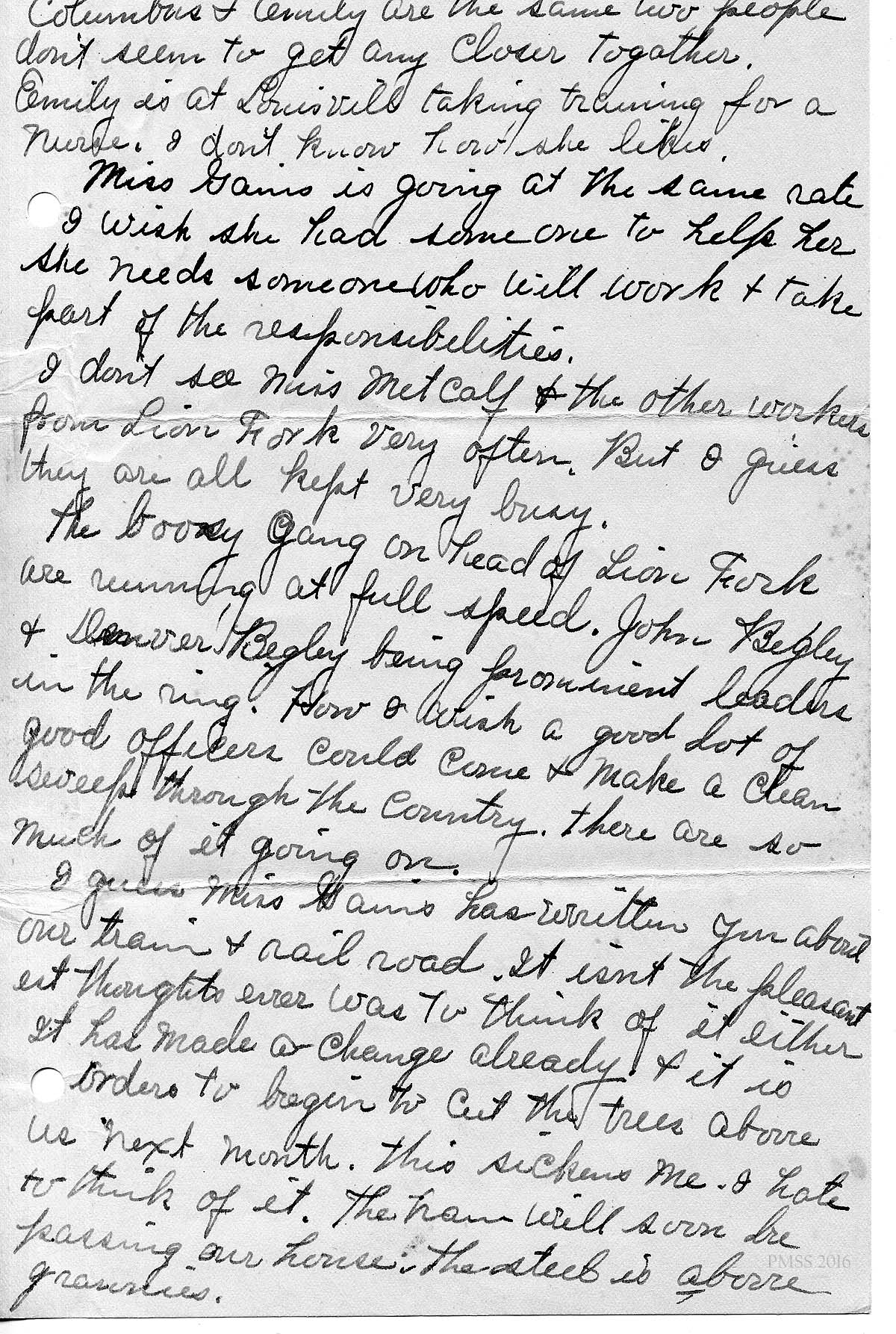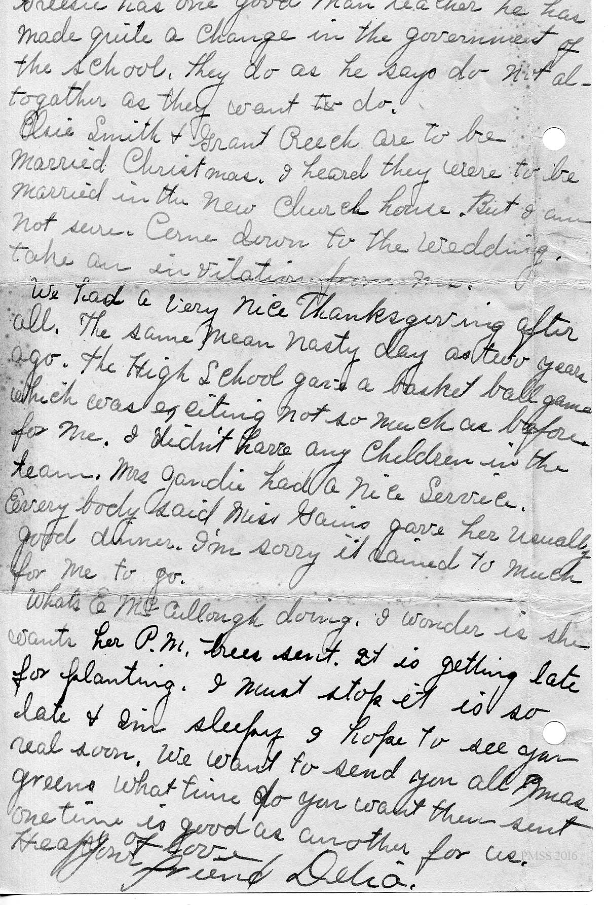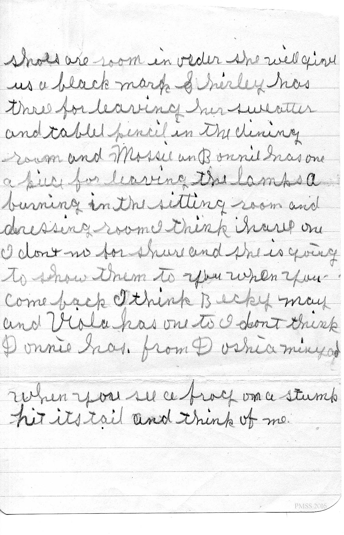 18. Mossie M. to Miss Butler, Nov. 17, 1917. “…I wish you could be here now and look at the vegetable cellar. It is looking nice. Dona and Miss Gaines and me worked…on it. We moved palates (sic, pallets) and swept the cellar clean….” Also mentions Miss de Long, Emily, Miss Secor, Lorain, Miss Pettit, Viola, Becky May, Miss Jeannette.