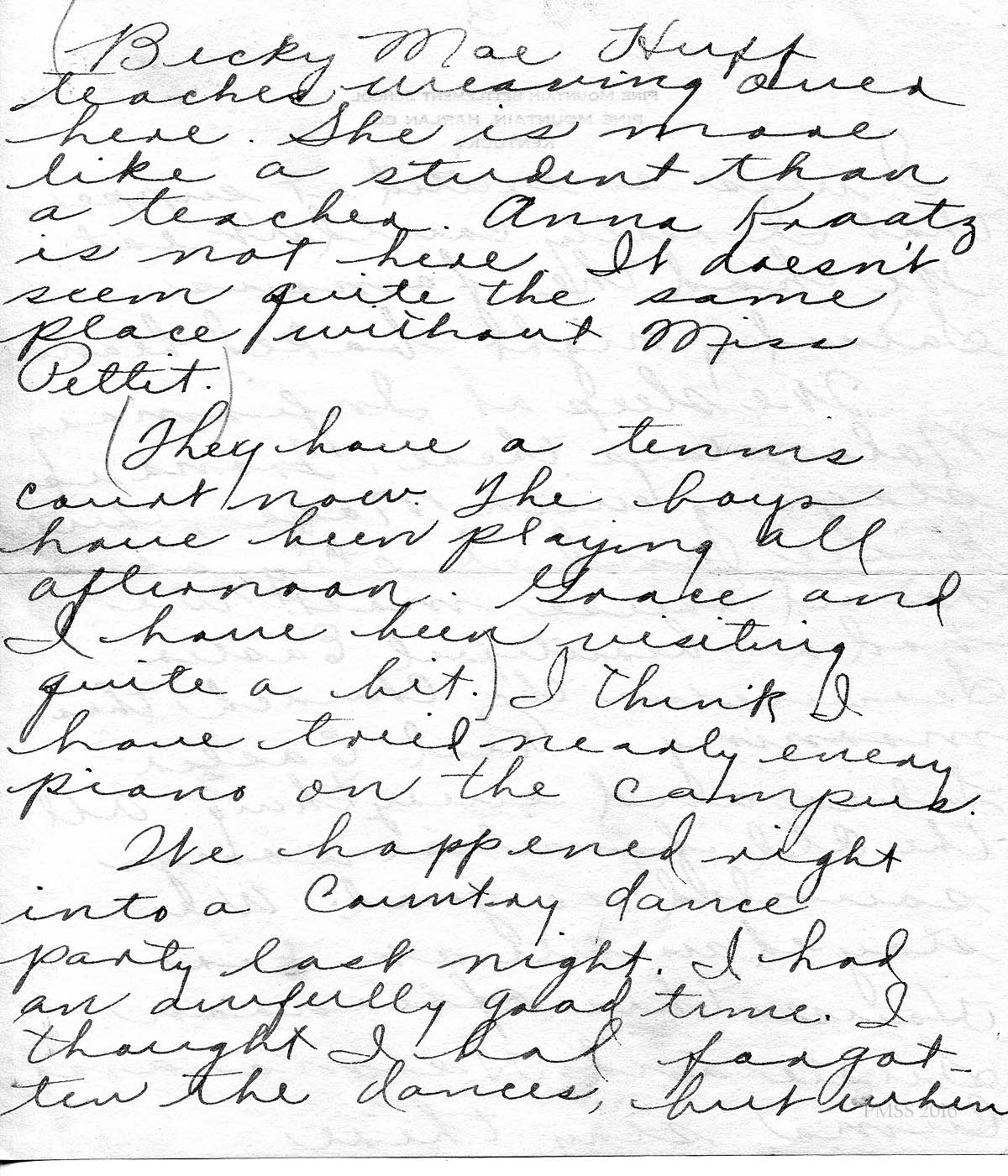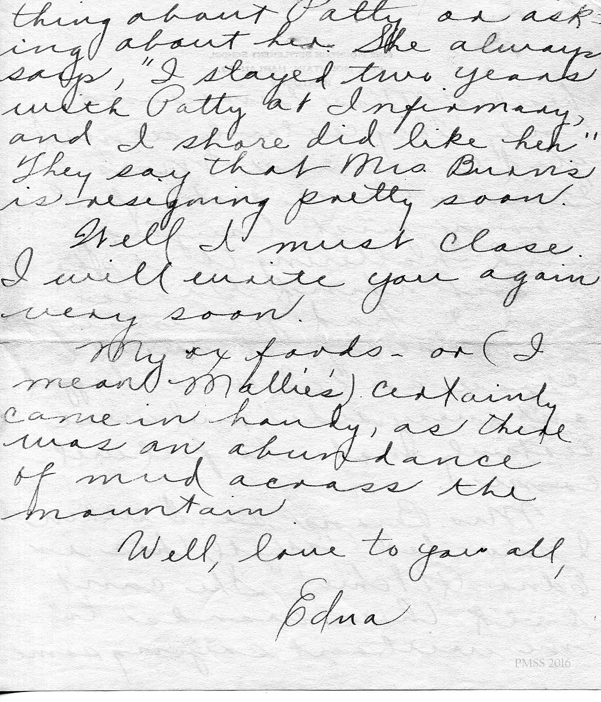 10. Edna Ritchie to “Mama,” April 5, Easter [no year]: “…we are really in Pine Mountain, and it seems that I am home again. I haven’t been so completely happy in I don’t know when….You can’t imagine what thrills we got when we came in sight of familiar places. It is the same old place, only a few things changed. The living room porch has been enclosed in glass. It’s a lovely place, lots of growing plants and goldfish…. They have a tennis court now….There is such a nice bunch of girls and boys. They seem to take much more interest in dancing than they used to in my day….”