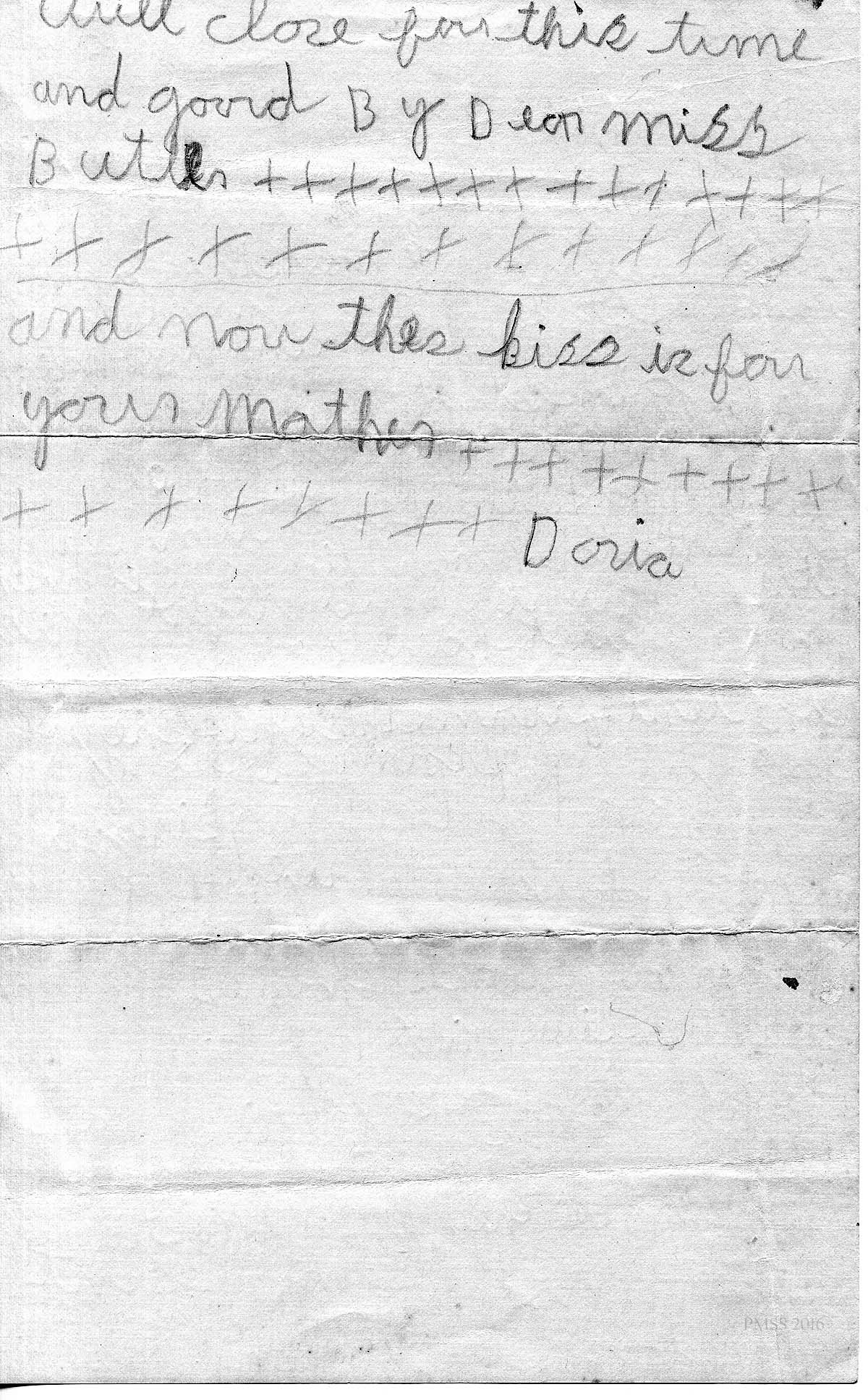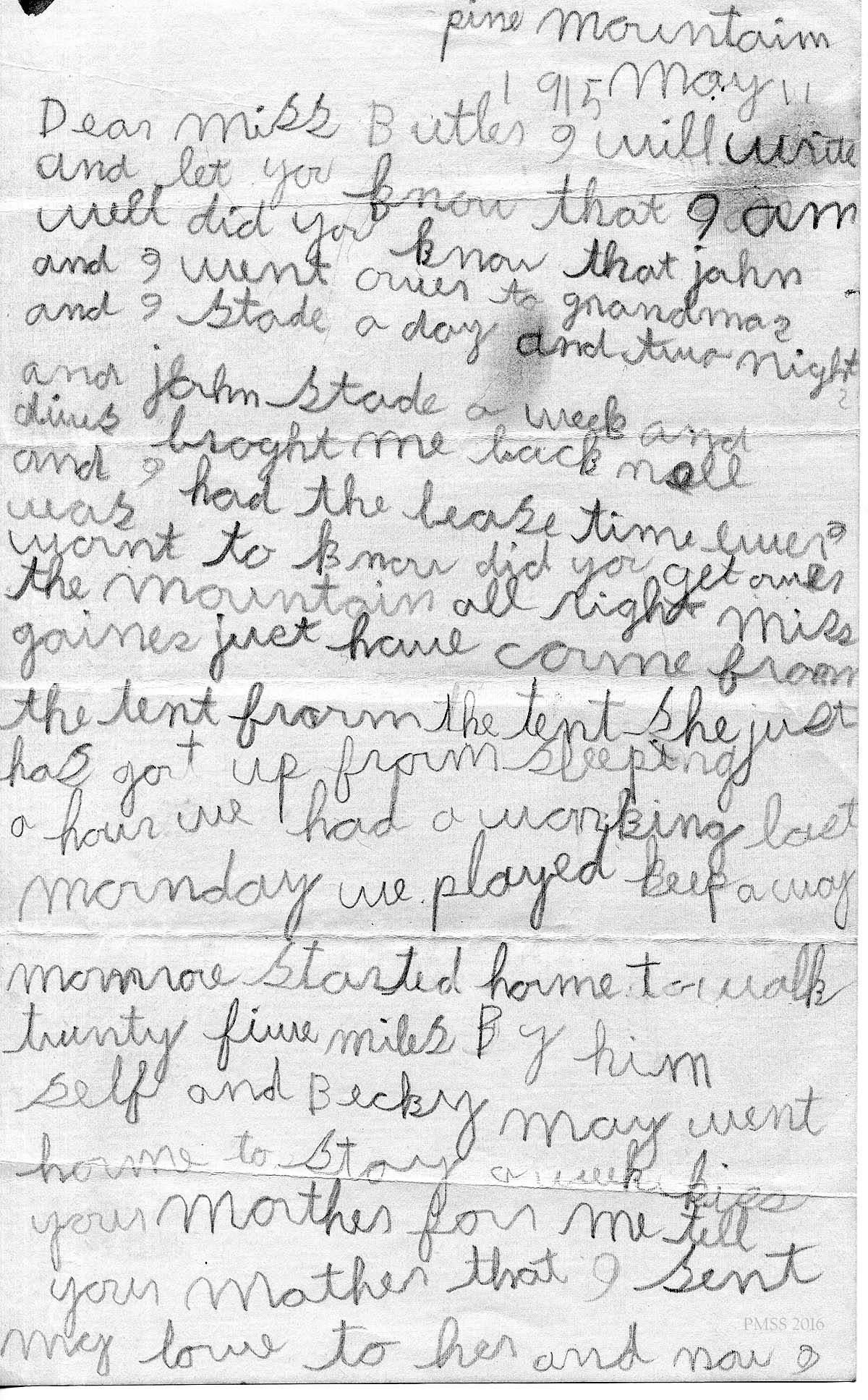 15. Doria to Miss Butler, May 11, 1915. “Monroe [?] started home to walk twenty-five miles by himself and Becky May went home to stay a week….” Mentions John and Miss [Ruth] Gaines.