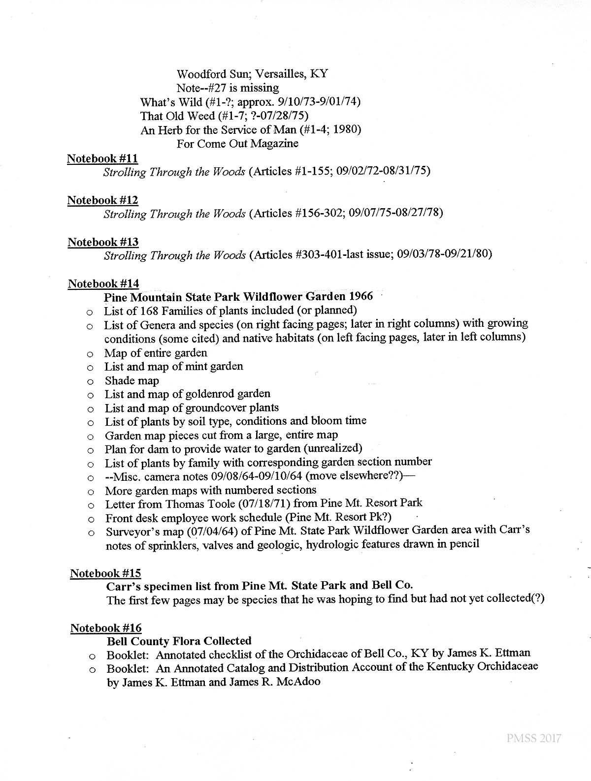 The Ellwood J. Carr Botanical Collection came to Pine Mountain in 1984 [?]. The very large collection was housed with the instructional materials for the Environmental Education Program located in the former Girl’s Industrial Building, now commonly called the “Plant Center.”