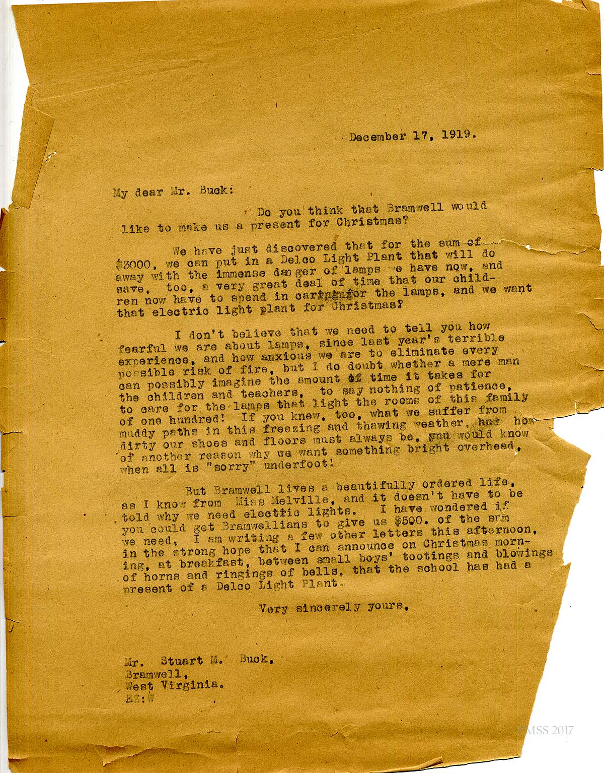 1919 February 18 To Miss Lillian G. Bullard, 39 Macon Street, Brooklyn, N.Y. thanking her for the recent donation following the destruction of Burkham School House I. … “Logs are being snaked down the mountain to the sawmill and rock is being gotten out for the foundations of the new buildings to take the place of the one that is gone….”