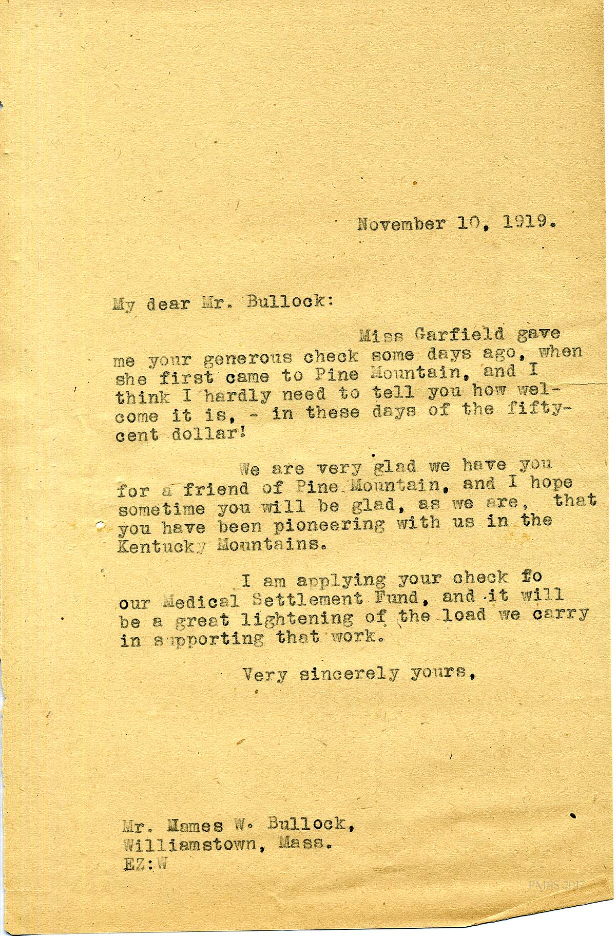 1919 February 20 To Mr. Stuart M. Buck, Bramwell, West Va. from Katherine Pettit. “We were so glad to know that you have thought of us and we are so glad to have your help as we buckle down to new problems, with many old ones still in the solving. Pine Mountain for a time lost some of its joyousness, but out of the fire has come a stronger vision of what we can mean to the mountains. .. We are rebuilding, of course, and even now are getting logs out of the woods and cutting stone for foundations.” [Handwritten note at bottom by Ethel Zande? Wells? You have prob. not heard that less than a mo[nth] ago we suffered a great loss in the fire wh. destroyed our Sch. Bldg. and the lives of 4 boys & a worker. The news sheet coming to you in a few wks. will tell you more of it. In the meantime we are so glad …etc.]
