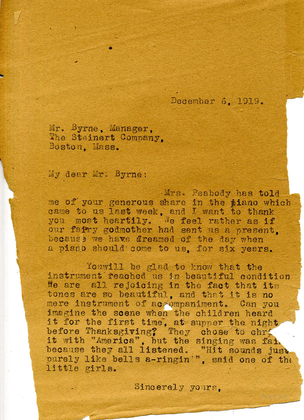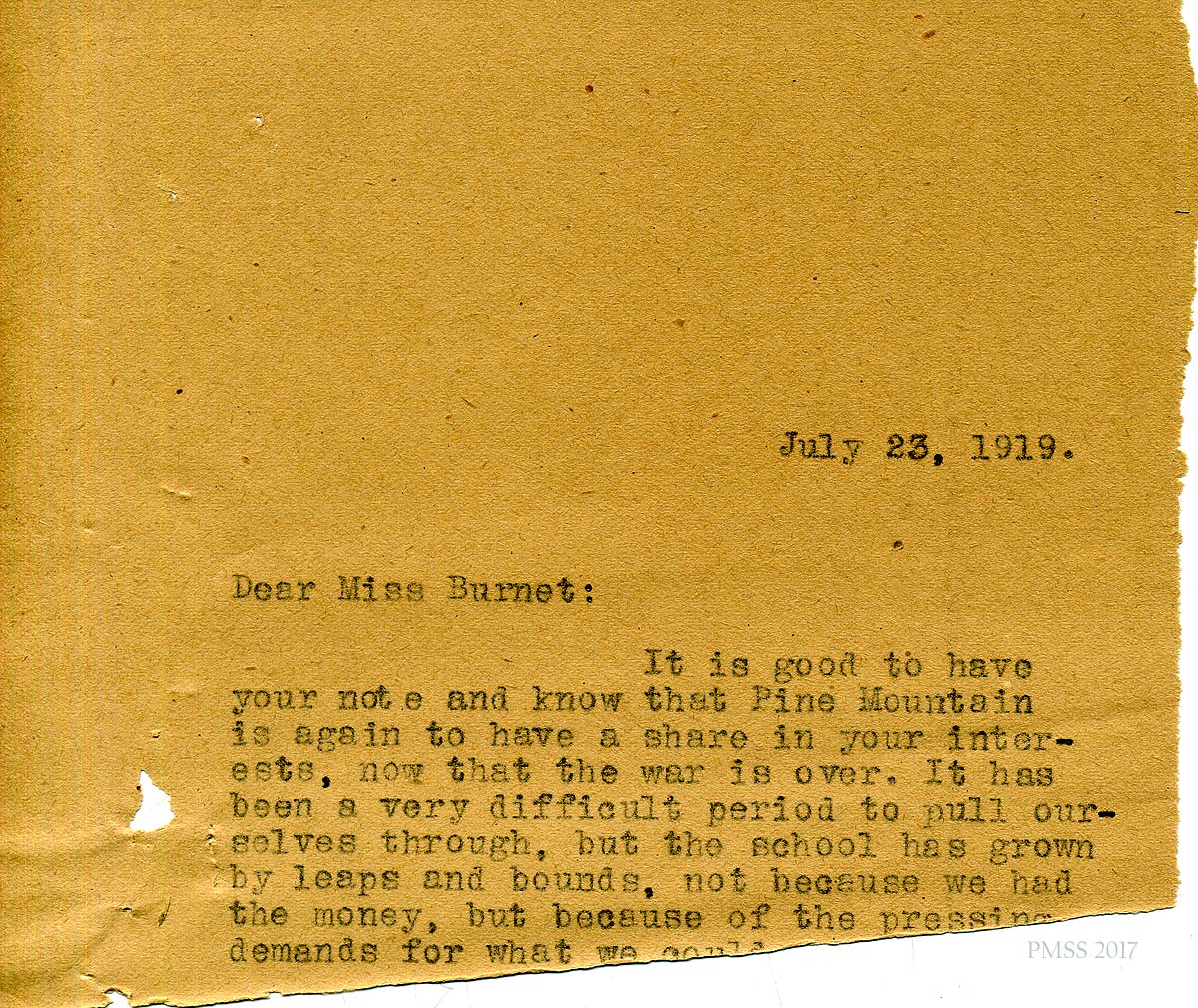 1919 March 18 To Mr. and Mrs. Daniel Burke, Hawthorne Place, Summit, N.J. from PMSS. Thanks them for their donation and adds, “… children are giving a play for the end of the school year, — Hiawatha scenes in real primeval forest. This year, though we work under added burdens and always with the sense of a great loss — school must go on as usual.”