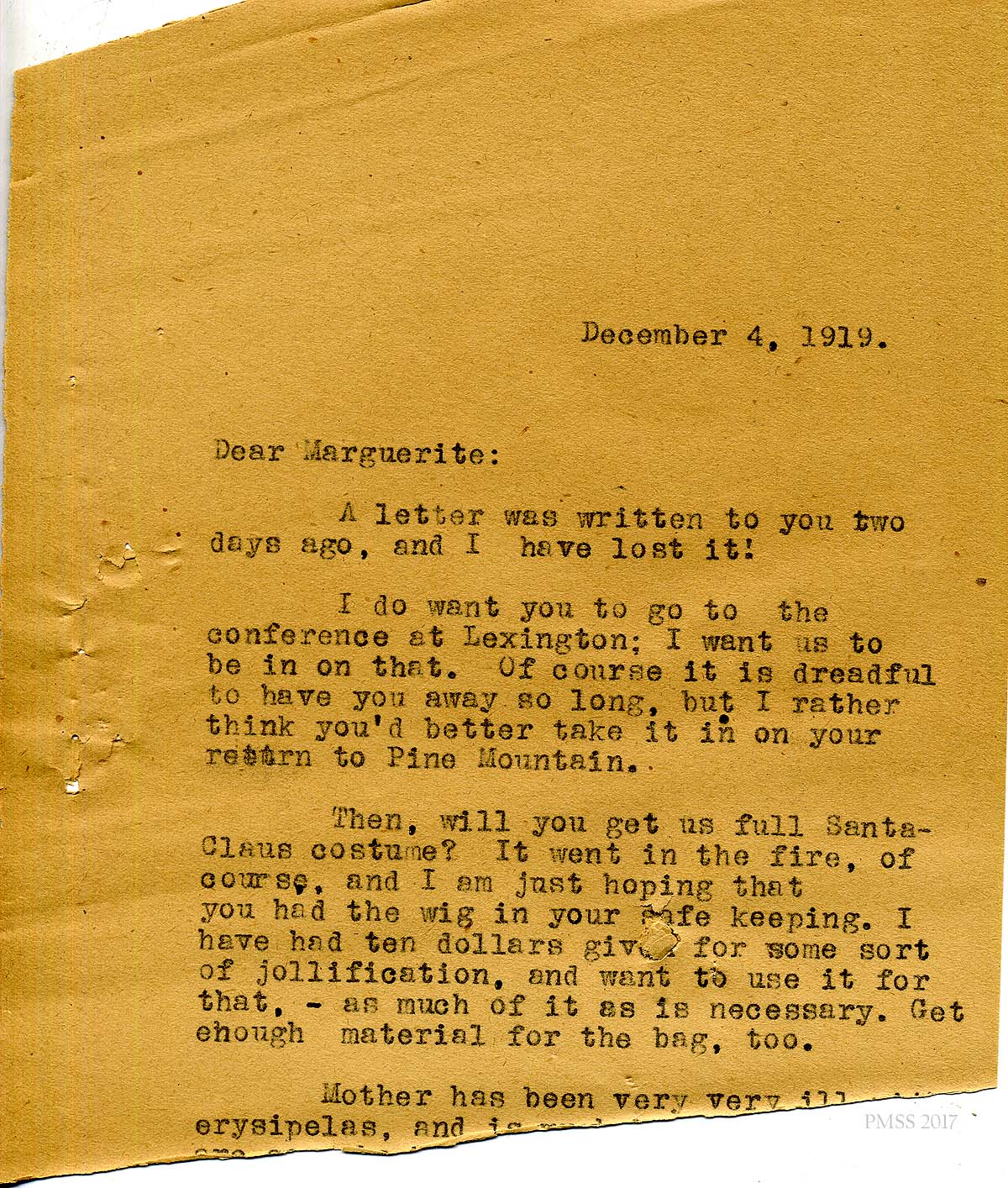 1919 December 2 To Marguerite [Marguerite Butler, staff] from Katherine Pettit [?] asking her “Will you get material for the Santa Claus costume, plenty of stuff for the bag too, in case we should want to use one? And incidentally, have you the wig, or was it with the other Santa Claus stuff in the schoolhouse? I am so hoping that you had it again, but my mind is a perfect blank. Please get material for the whole costume and get it made up. We have just had ten dollars given us to use for a regular jollification, and I am going to use as much of it for this purpose as is necessary because I believe that we really ought to have a good one.”