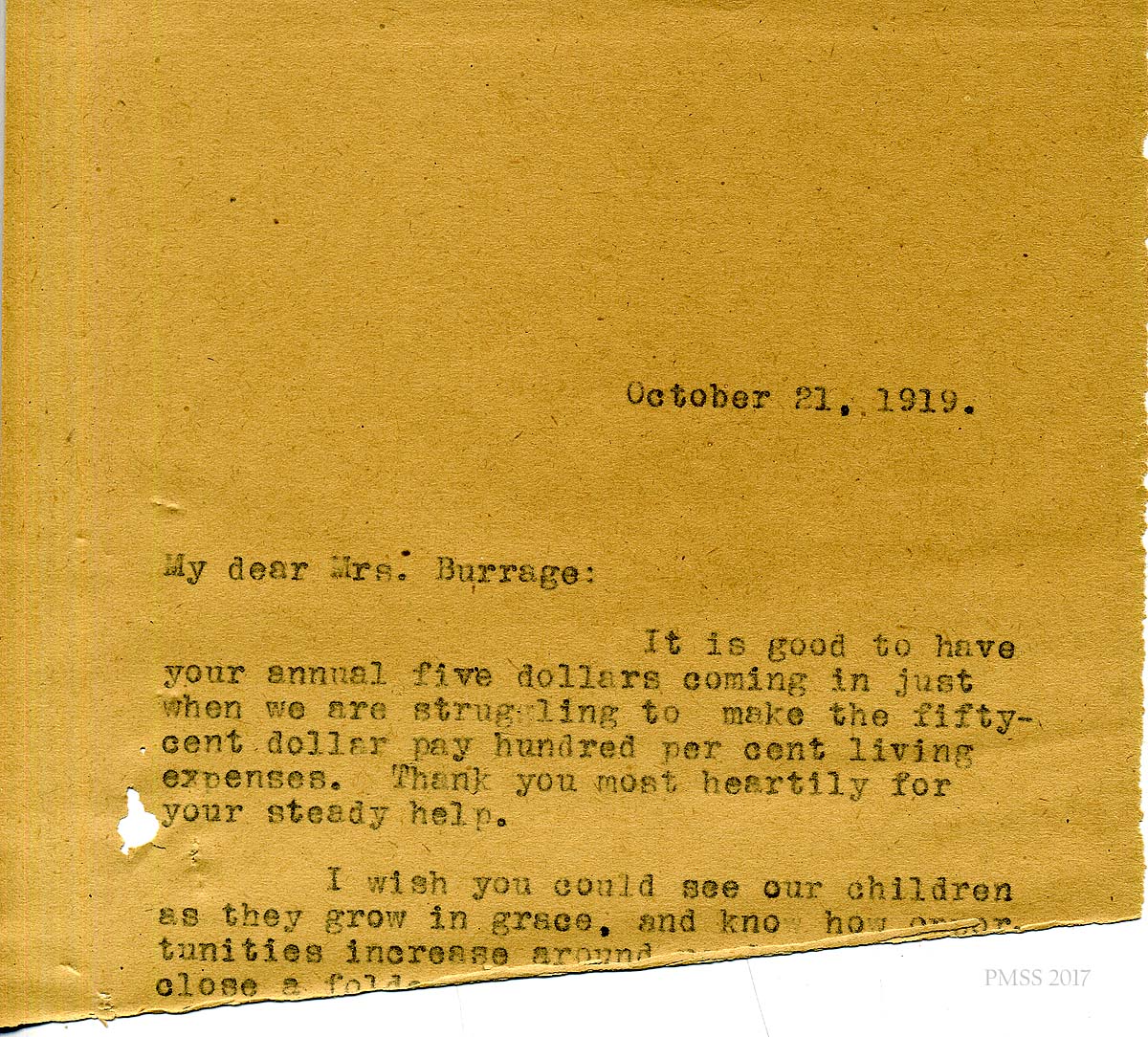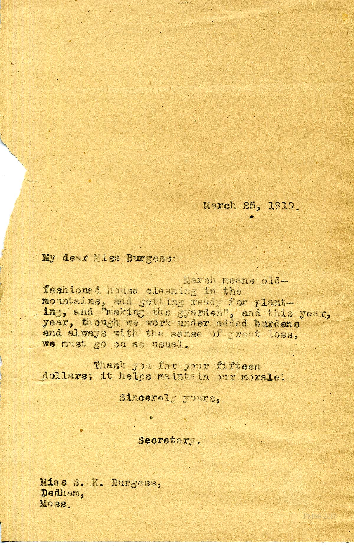 1919 March 25 To Miss S. K. Burgess, Dedham, Mass. from PMSS thanking her for her recent donation to the school “…it helps maintain our moral…” after the loss of the Burkham School House I.