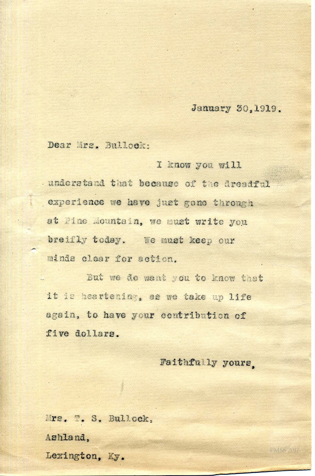 1919 March 12 To Mrs. Margaret Buell, Treas. Ashland Woman’s Club, Ashland, KY. from PMSS. Sends news of the recent fire and destruction of Burkham School House I and the steady support of the club of PMSS.
