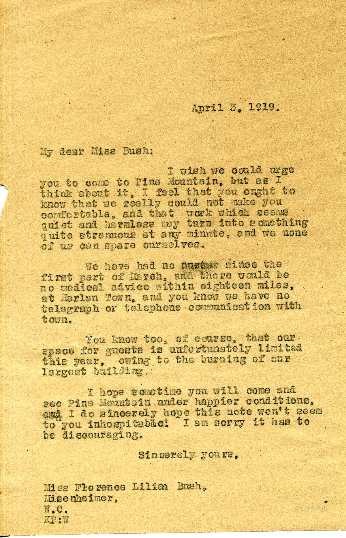 1919 April 3 To Miss Florence Lilian Bush in Misenheimer, NC from Katherine Pettit regarding Bush’s proposed trip to PMSS. Pettit discourages Bush from coming to the School due to the stressful conditions following the fire and destruction of Burkham School House I. She invites a later trip to the School.
