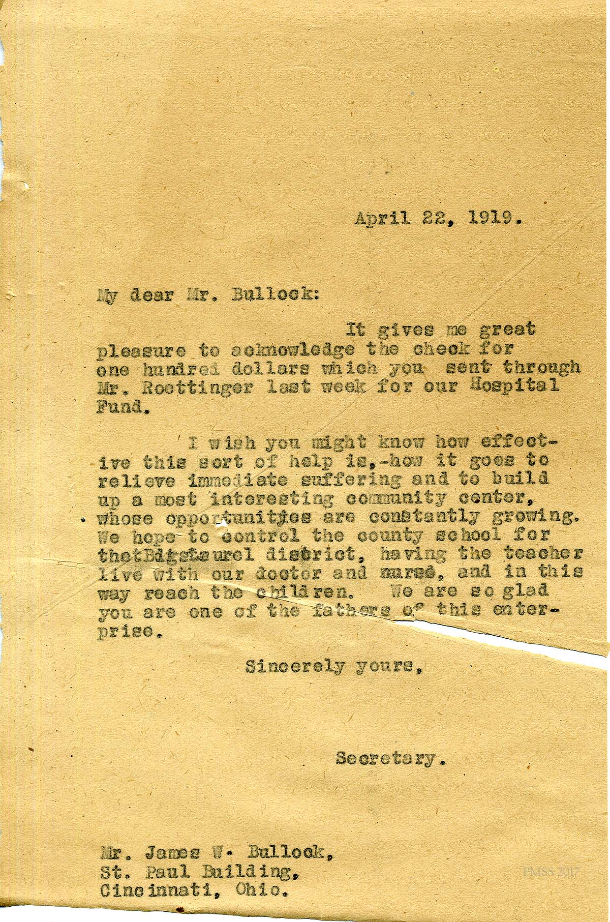 1919 April 22 To Mr. James W. Bullock, St. Paul Building, Cincinnati, OH from PMSS thanking him for the recent donation to the school through Mr. [Philip] Roettinger, a member of the Board of Trustees of PMSS for the rebuilding after the fire and destruction of Burkham School House I.