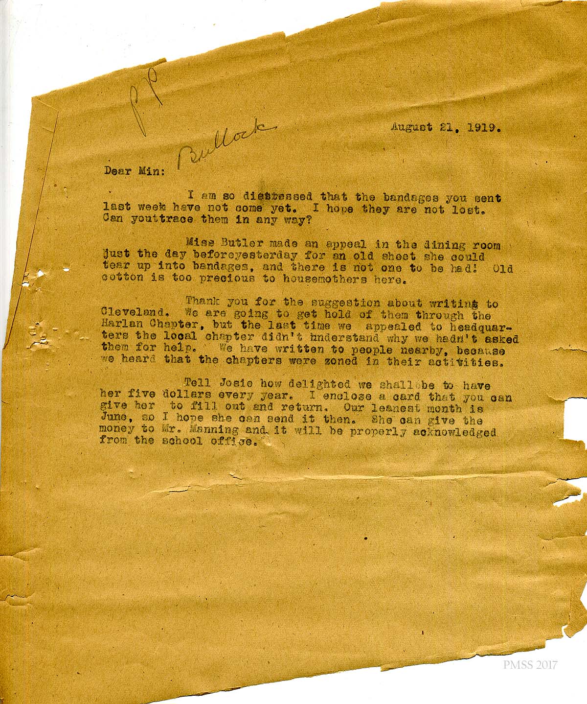 1919 August 21 To “My dear Min” [Mrs. Waller Bullock] sister of Katherine Pettit from Pettit admonishing her that the bandages that were sent had not arrived. Notes that June is the “leanest month” and that any donations may be given to Mr. Manning [Board of Trustees] to be sent to the School office.