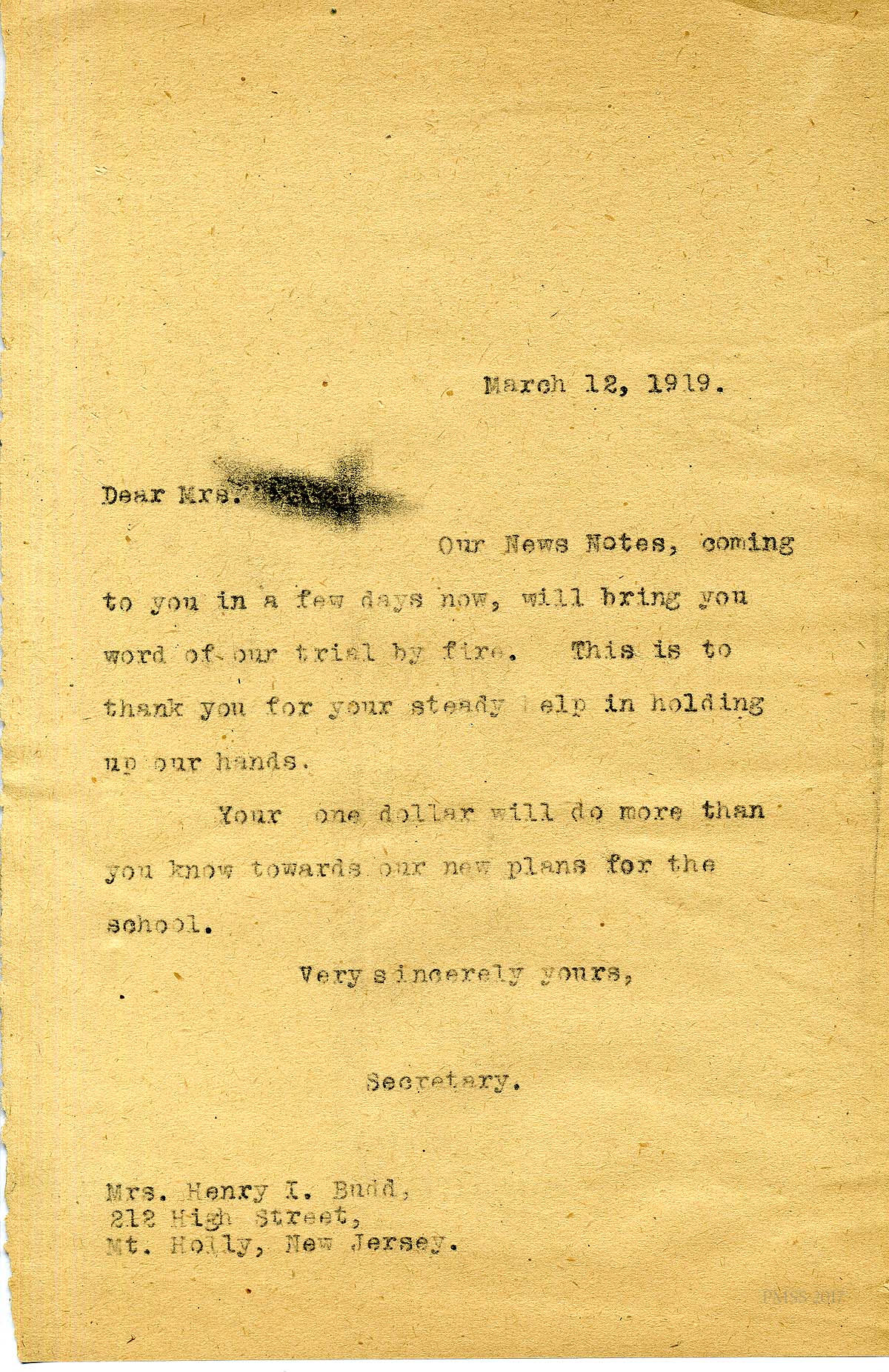 1919 March 12, 1919 To Mrs. Henry I. Budd from PMSS thanking her for her recent donation to the School after the Burkham School House I fire and destruction.