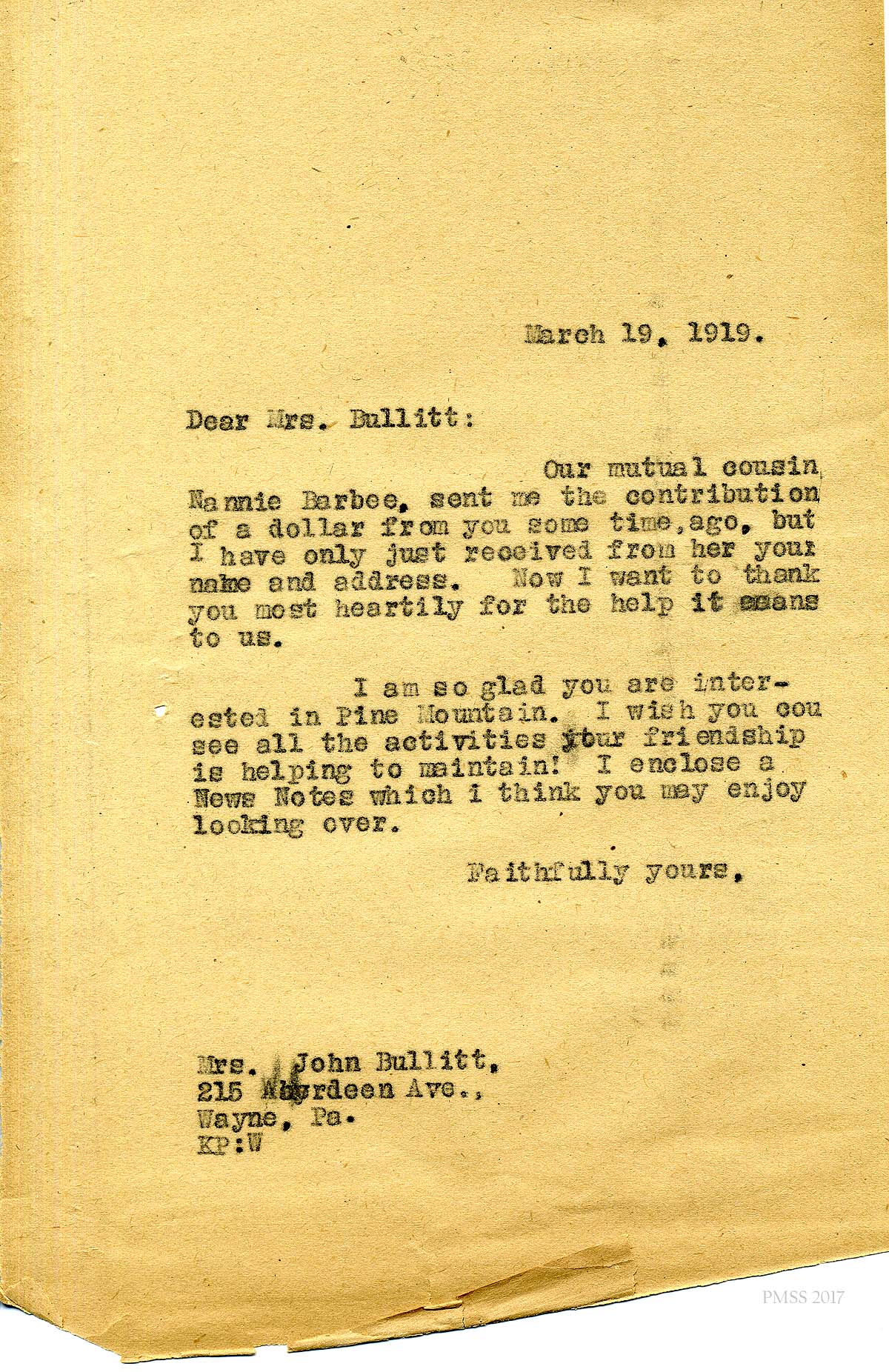 1919 March 19 To Mrs. John Bullitt, 215 Aberdeen Ave., Wayne, PA from Katherine Pettit. Pettit notes, “Our mutual cousin Nannie Barbee, sent me the contribution of a dollar from you some time ago, but I have only just received from her your name and address…” Thanks her for donation.