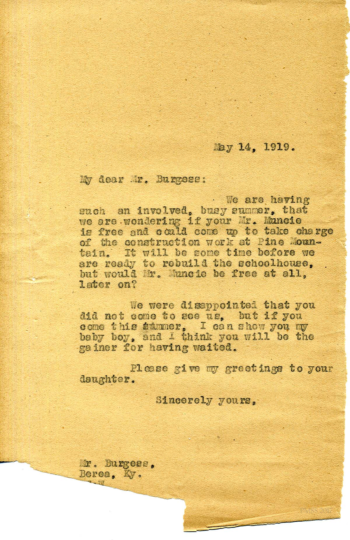 1919 May 14 To Mr. ? Burgess, Berea Kentucky, from Ethe Zande. The note requests if Mr. Muncie, a friend of Burgess, could come to PMSS and supervise the construction work at the School. “It will be some time before we are ready to rebuild the schoolhouse, but would Mr. Muncie be free at all, later on?” She also notes that if Burgess comes later in the summer “I can show you my baby boy, and I think you will be the gainer for having waited …”