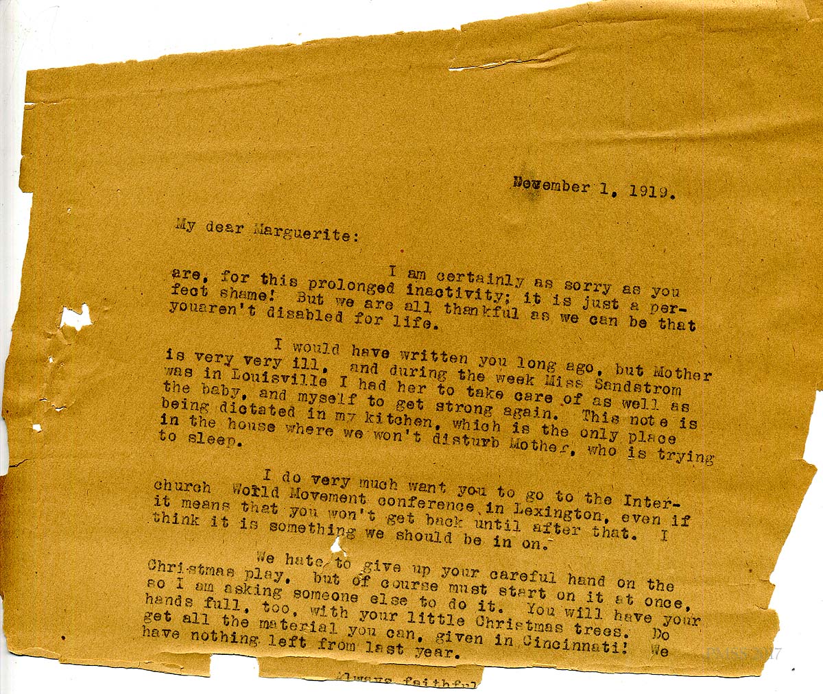 1919 November 1 To Marguerite Butler from Ethel Zande. A letter saying how sorry the school is for her “… prolonged inactivity, it is a perfect shame! But we are all thankful as we can be that you aren’t disabled for life.” EthelZande notes how complicated her life is with her ailing mother and her duties as a new mother. Asks Marguerite to go to the Inter-church World Movement conference in Lexington as “it is something we should be in on,” and tells her that her duties for Christmas arrangements have been handed over to someone else.