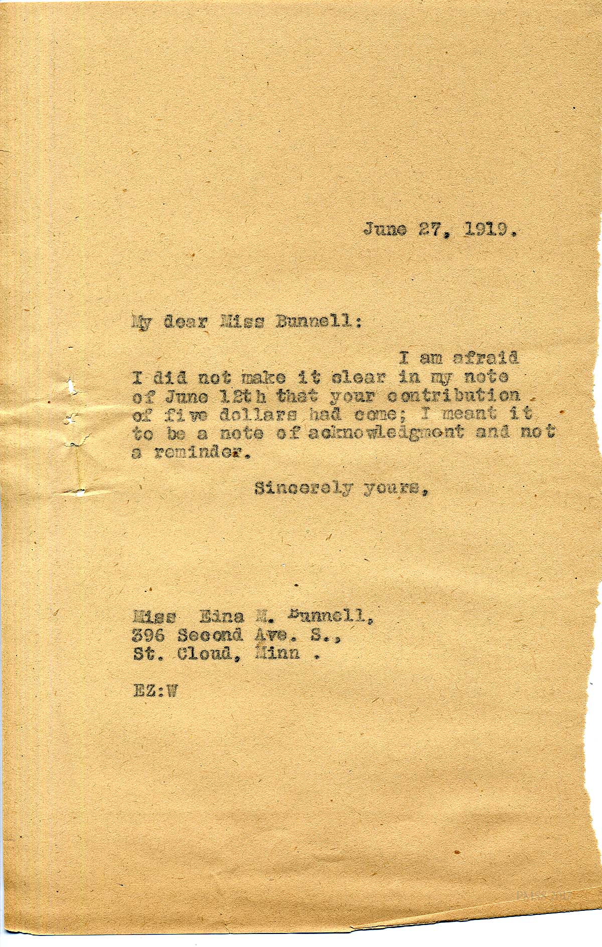 1919 June 27 To Miss Eina M. Bunnell, 396 Second Ave, S., St. Cloud, Minn. from Ethel Zande. Apology for earlier note regarding her donation.