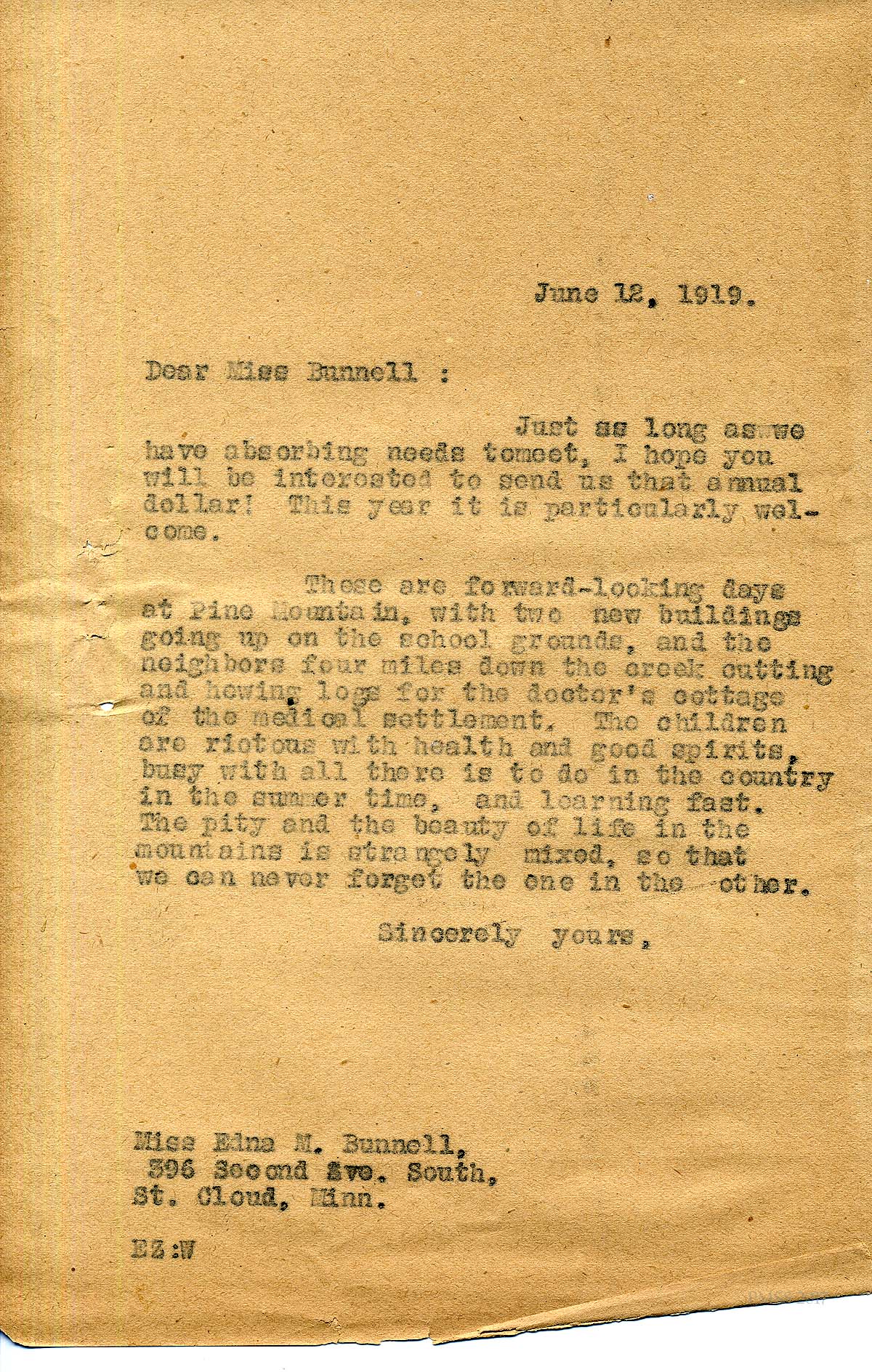 1919 June 12 To Miss Eina M. Bunnell, 396 Second Ave. S., St. Cloud, Minn from Ethel Zane. Asking for annual donation. She says of life in the community, “The pity and the beauty of life in the mountains is strangely mixed so that we can never forget the one in the other.”