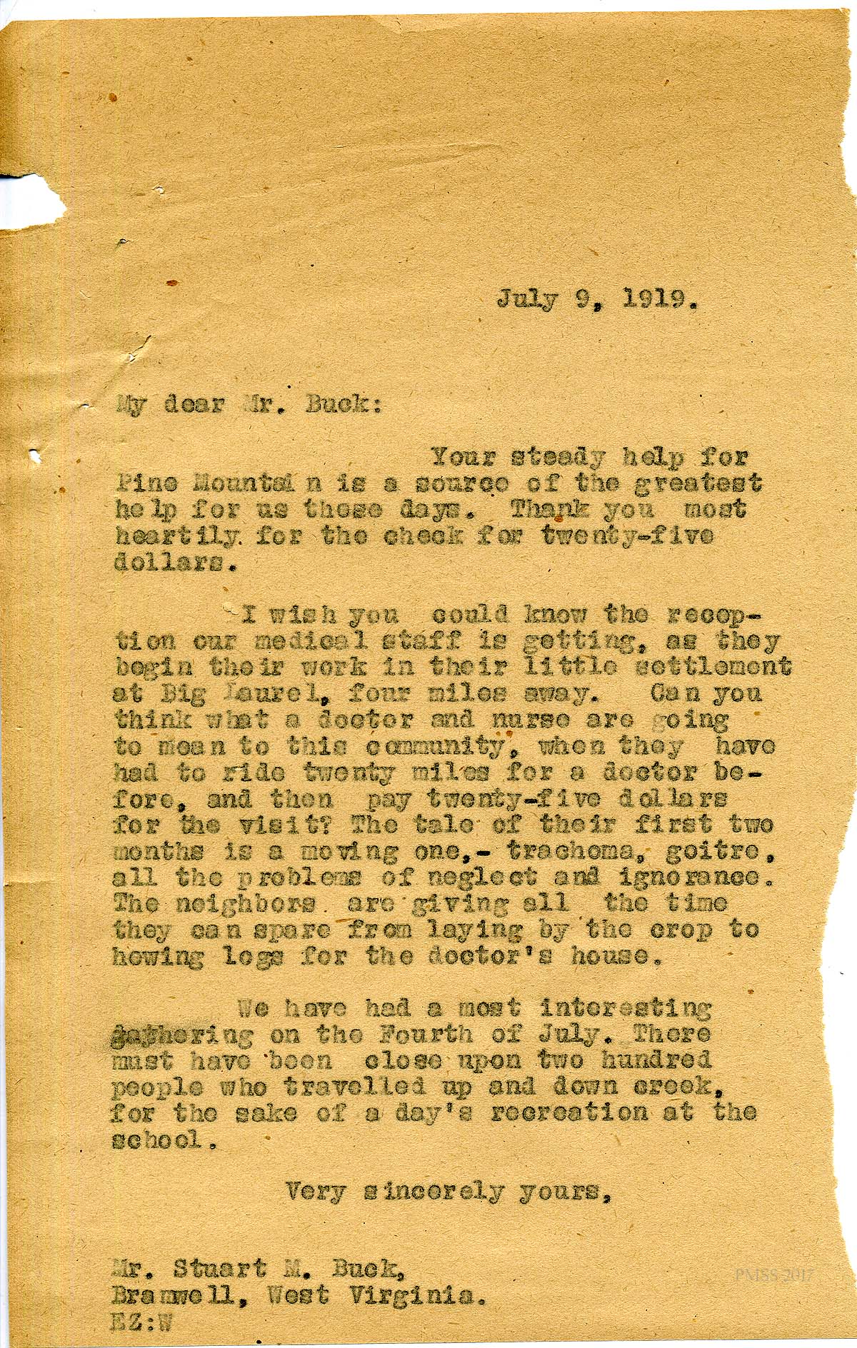 1919 July 9 To Mr. Stuart M. Buck, Bramwell, West Va. from Ethel Zande. Thanking him for his check to PMSS. Reports on the work going on at the Medical Settlement: “I wish you could know the reception our medical staff is getting, as they begin their work in their little settlement at Big Laurel, four miles away. Can you think what a doctor and nurse are going to mean to this community when they have had to ride twenty miles for a doctor before, and then pay twenty-five dollars for the visit? The tale of their first two months is a moving one, — trachoma, goiter, all the problems of neglect and ignorance. The neighbors are giving all the time they can spare from laying by the crop to hewing logs for the doctor’s house. … We have had a most interesting gathering on the Fourth of July. There must have been close upon two hundred people who traveled up and down creek for the sake of a day’s recreation at the school.”