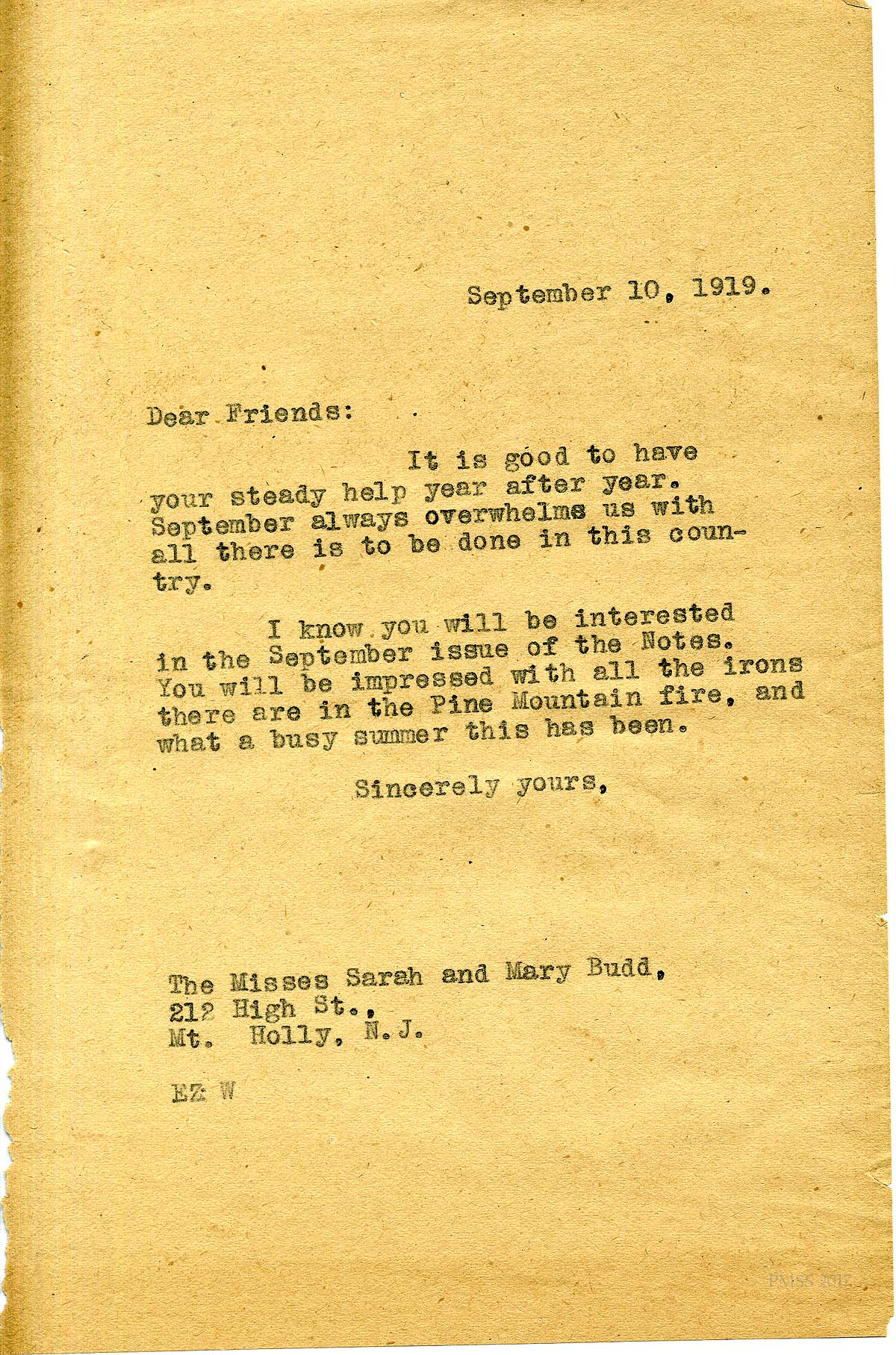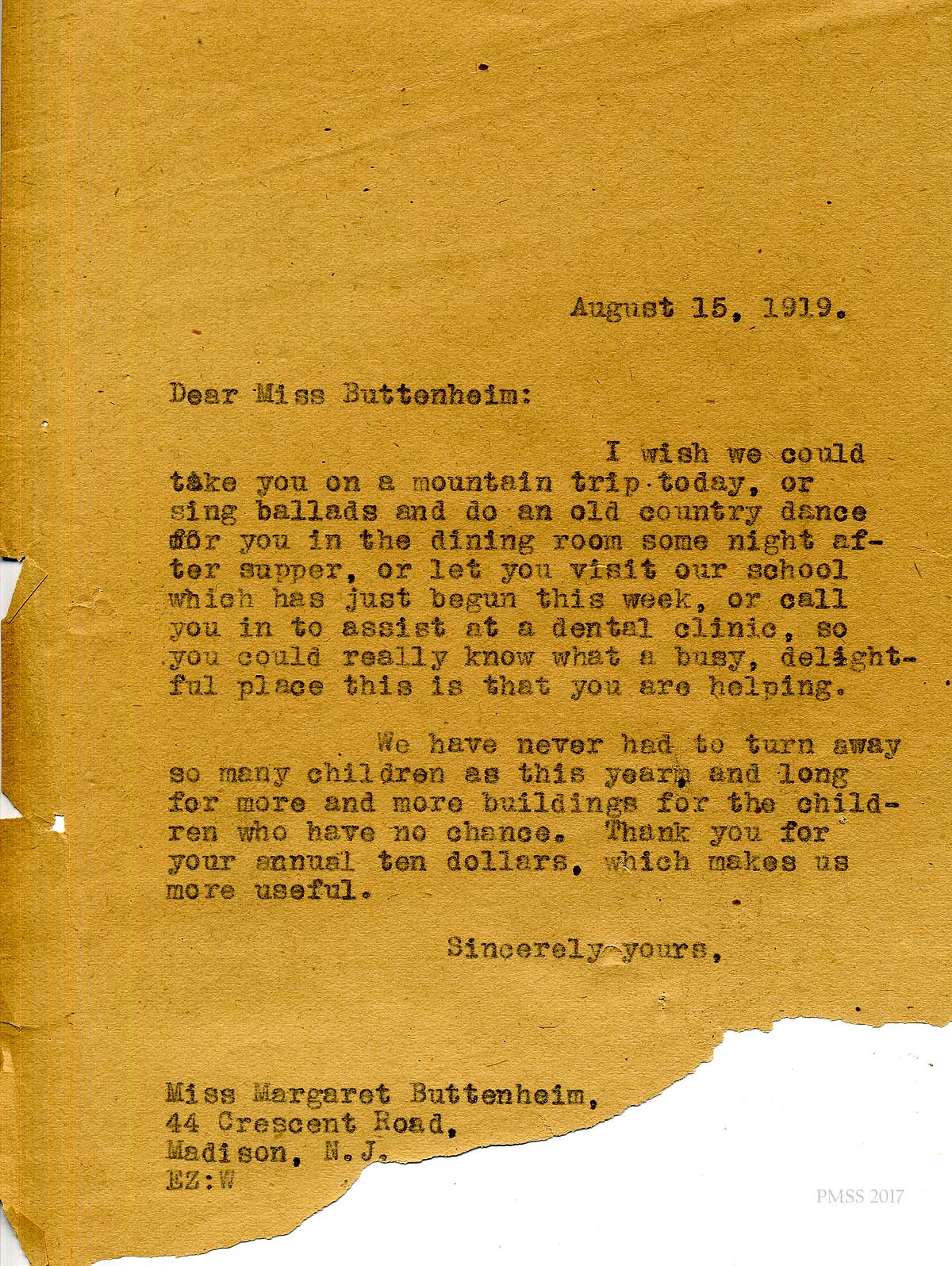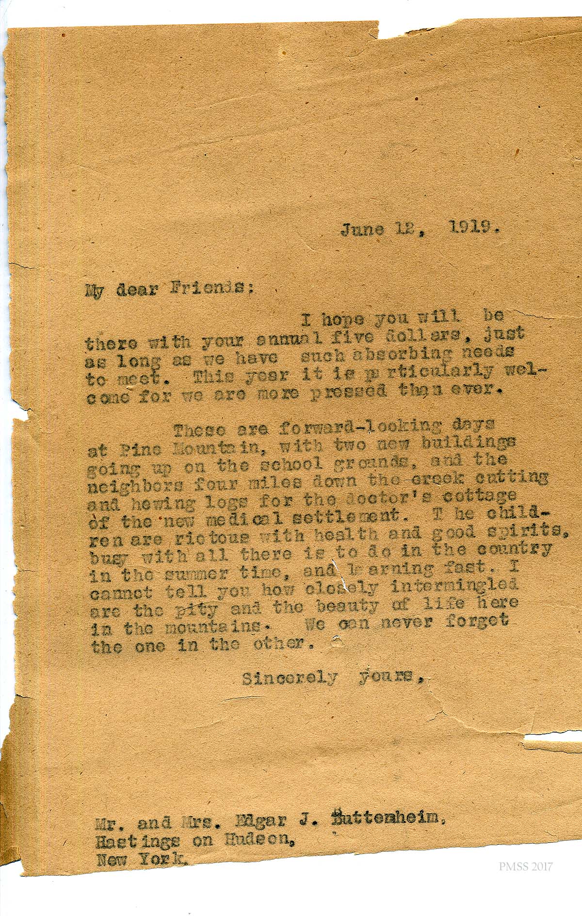 1919 June 12 To Mr. and Mrs Edgar J. Buttenheim, Hastings on Hudson, New York from Ethel Zande [?]. Reminds donors of the annual subscription. Repeats the sentiment: “”The pity and the beauty of life in the mountains is strangely mixed so that we can never forget the one in the other.”